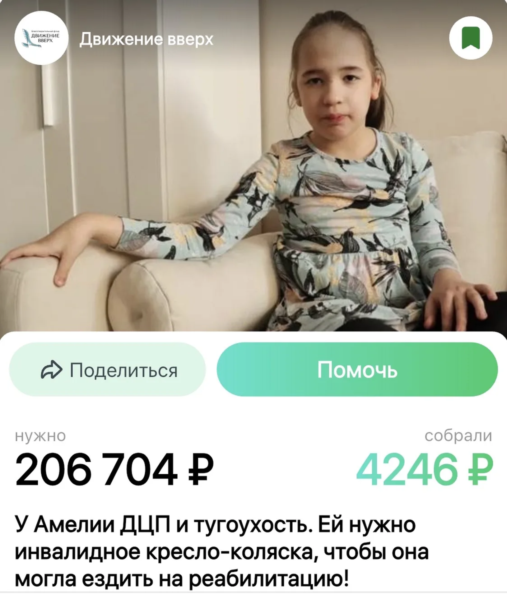 Ваша помощь очень нужна подопечным детям нашего фонда «Движение вверх» – Амелии Рахмановой и Полине Шульгиной. Сбор средств осуществляется в приложении Tooba. Амелия родилась на 28-29 неделе, с ростом 40 см и весом всего 1400 г. На 19 день своей жизни малышке пришлось пережить первую серьезную операцию на сердце. В 1,5 года девочке сделали еще одну сложную операцию – поставили первый кохлеарный имплант, чтобы она могла хотя бы одним ухом услышать звуки. Список диагнозов Амелии звучит неутешительно: ДЦП, спастическая диплегия, двусторонняя нейросенсорная тугоухость 4 степени, кохлеарная имплантация слева и справа, нижний мышечный парапарез средней степени, задержка психоречевого развития. В 2024 и 2025 гг. Амелии сделали сложные операции – на спинном мозге и ортопедическую. Девочка восстанавливается после них благодаря курсам реабилитации, для поездок на которые, а также для прогулок, ей необходимо инвалидное кресло-коляска – оно позволит соблюдать правильное положение тела, рук, ног и