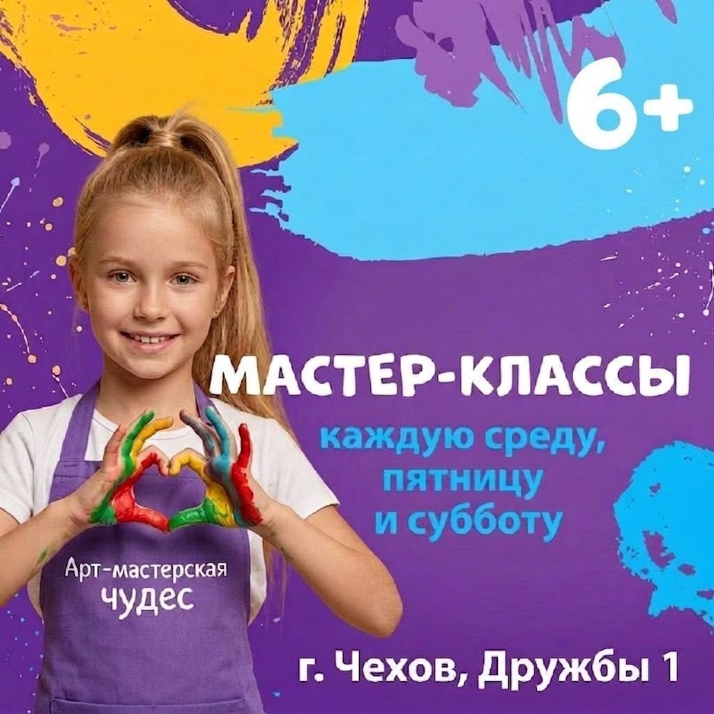 ✨ Приглашаем на мастер-классы и арт-вечеринки для детей и взрослых! 📅 Каждую среду и пятницу у нас проходят креативные мастер-классы и занятия по рисованию. Откройте в себе художника, попробуйте новые техники и создайте свои маленькие шедевры! 🎉 Каждую субботу — арт-вечеринки для всей семьи. 📍 Ждём вас в Арт-мастерской чудес — месте, где рождаются идеи и вдохновение! 8 апреля рисуем космос бесплатно!!! Запись 👇👇👇 🚫 Возраст: 6+ 🏢 Центр развития интеллекта "ЛидерУм" 📍 г. Чехов, ул. Дружбы, 1 (подъезд 5, этаж 1) 🔗 Оставить заявку: https://t.me/cent_LiderUm ⭐Поддержать канал голосом https://vk.ru/club231893736 https://max.ru/join/-U4_6gj9-kIvU8J2hPcOJsG4apbkWwlC21KlRm_RQ6I ✅ Мероприятия Чехов https://dzen.ru/id/66cc4b48e9ef144699238a51 https://vk.ru/chekhov_events http://dzen.ru/chekhov_events