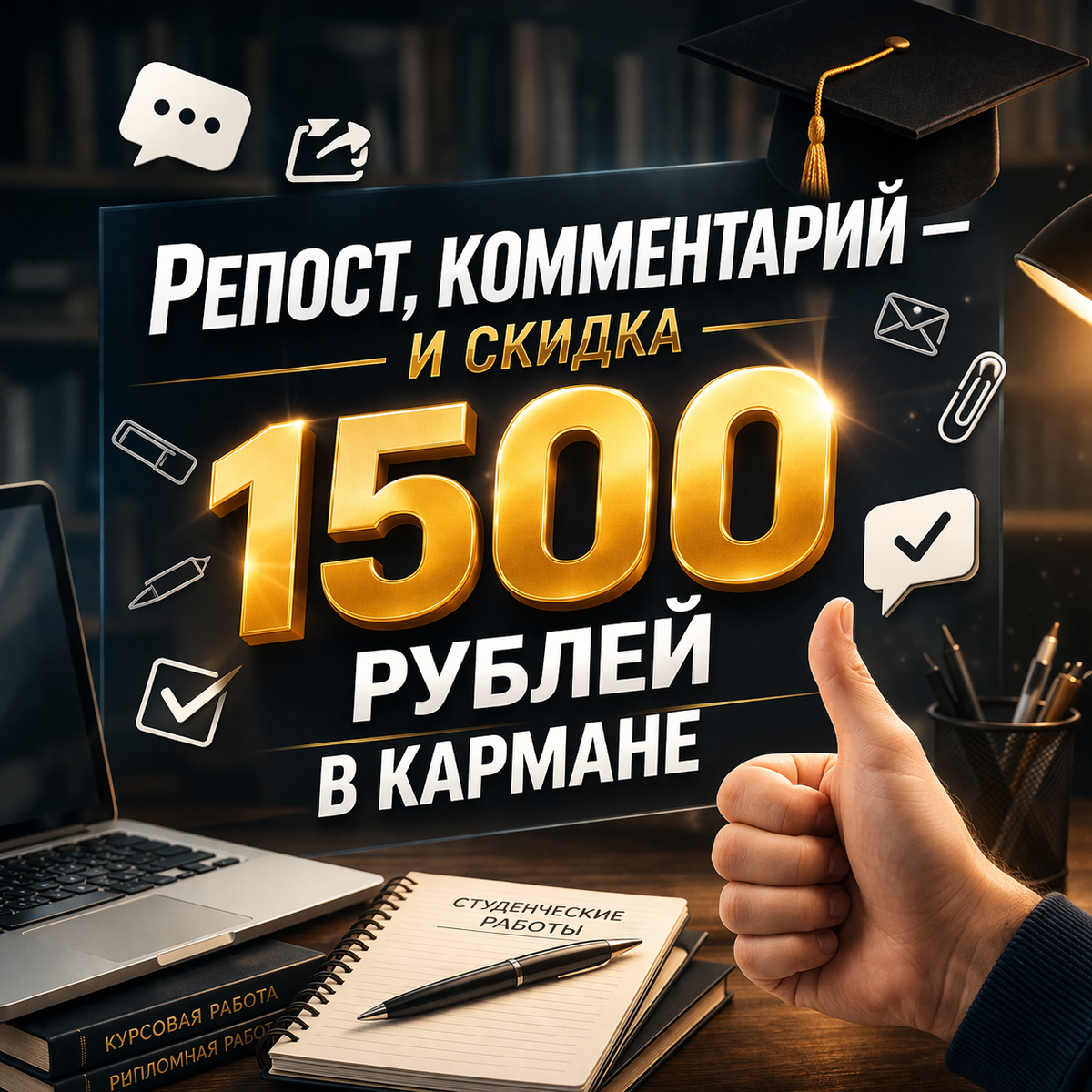Я даю такую возможность. Условия честные и простые: За все вместе - 1500 рублей чистой выгоды. 😉 Скидка будет действовать на любой тип работы: диплом, курсовую, эссе, контрольную, реферат и даже диссертацию или научную статью. 👍 Перешлите пост одногруппнику, который застрял над дипломом - так вы сможете помочь другу решить проблему, а мне найти клиента. ⚠️ Если выполнили все условия и хотите забрать свою скидку - пишите в комментариях "ГОТОВО ✅". Рад буду ответить на все вопросы. НАПИСАТЬ МНЕ В ВК или написать в Telegram @volgapkinStud МОЙ КАНАЛ В TELEGRAM СООБЩЕСТВО В ВК ОТЗЫВЫ О МОЕЙ РАБОТЕ