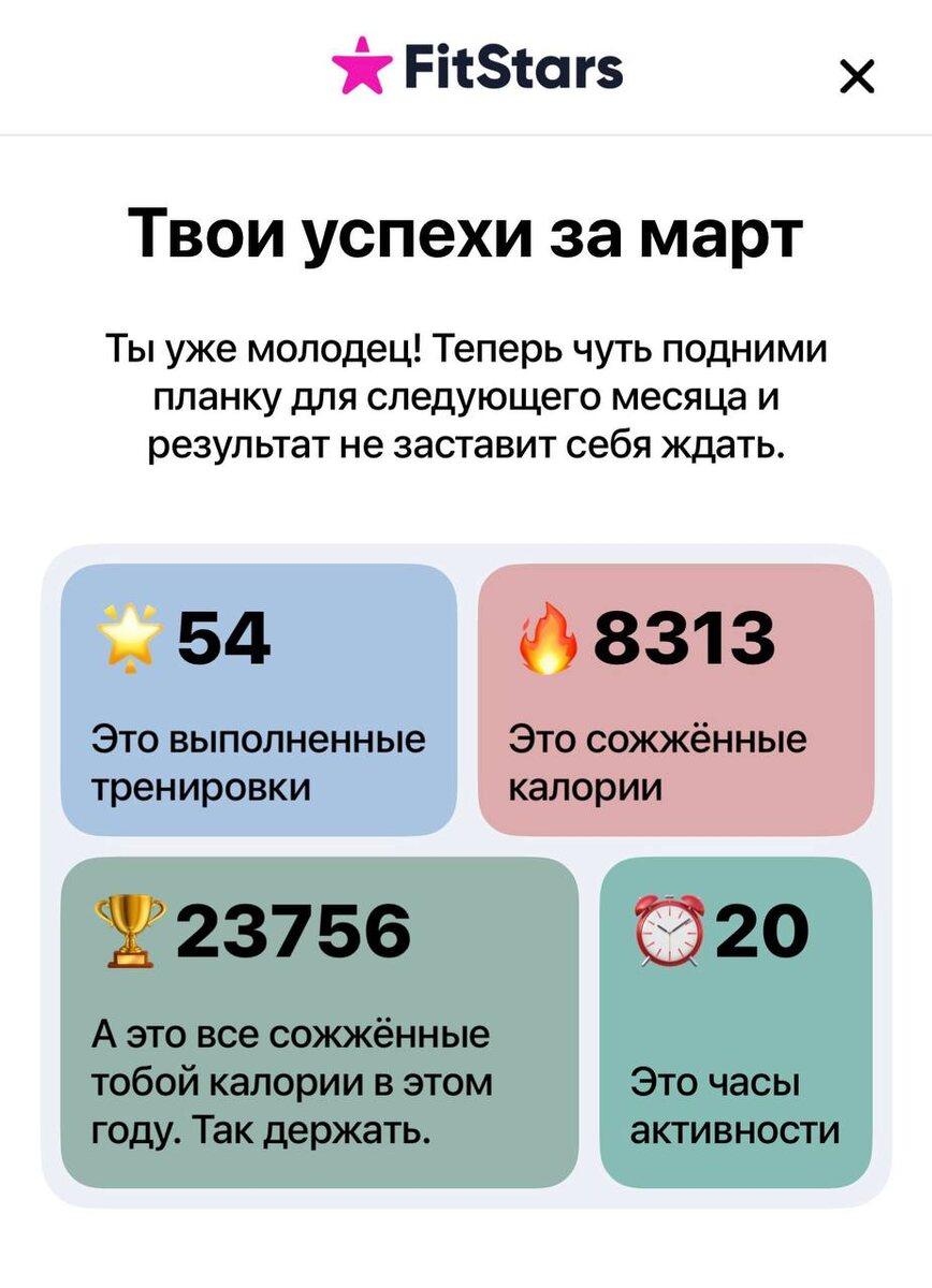 : 54 тренировки и 20 часов активности с FitStars! Зарядки, пилатесы, силовые, растяжки, МФР, йога, и тд и тп. А у вас там что? Показывайте! ⤵️ Свою статистику вы можете увидеть в качестве пуша при первом заходе в приложение в первый день месяца