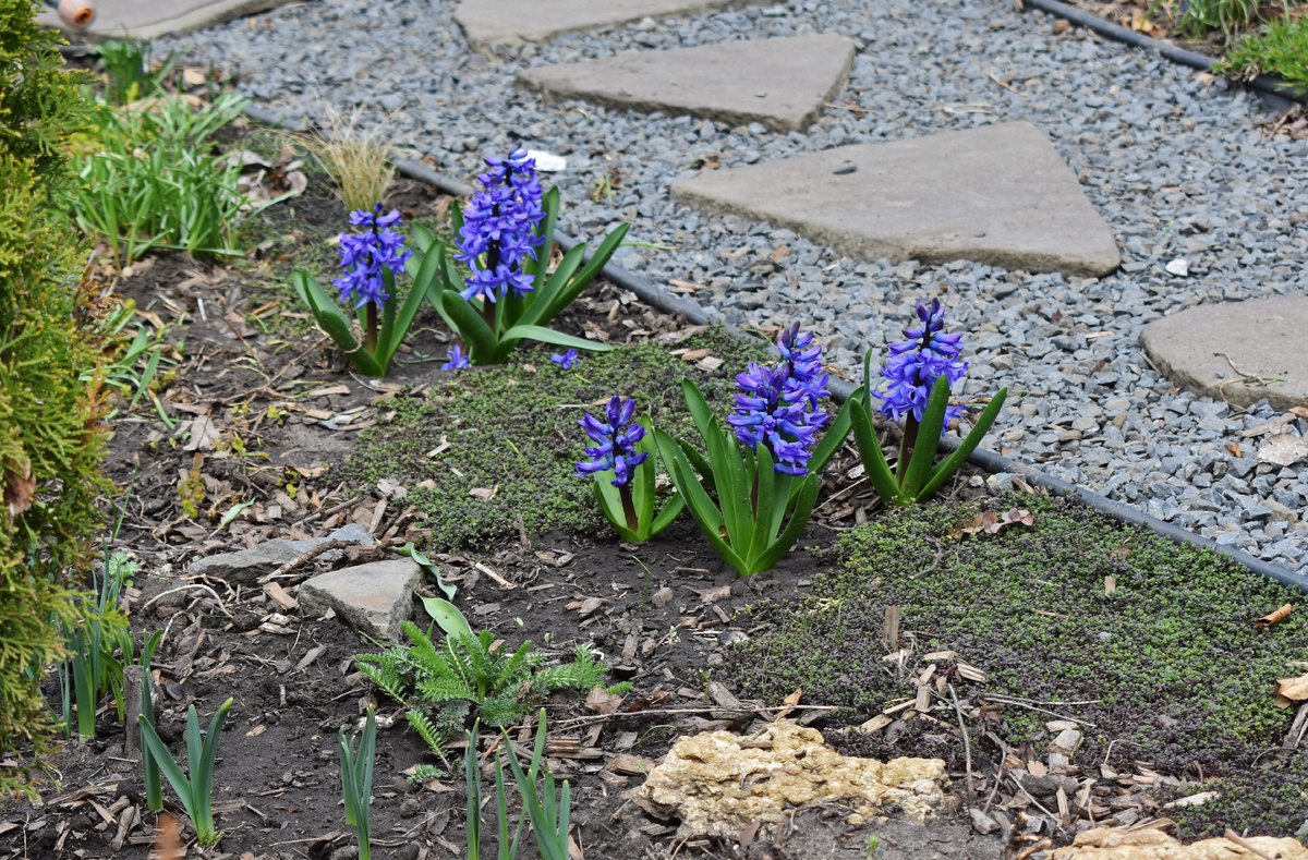 Синие посажены на самом солнечном месте и первыми начинают весеннее выступление. 4 года тому купила всего одну луковичку этого гиацинта к 8 марта. И за это время он так хорошо размножился. Может, мыши помогли, подъев донце. А именно повреждённое донце запускает у гиацинтов желание множиться. И хорошо, что так вышло. Мне нравится сложный цвет этих гиацинтов и легкий нрав. Плотную куртинку рассадила только в прошлом году. А дальше буду за ними наблюдать. Интересно понять, быстрое размножение - это доля везения или просто особенность сорта. А запах у этих гиацинтов, действительно, потрясающий. И слышно его в пределах 10 м точно.