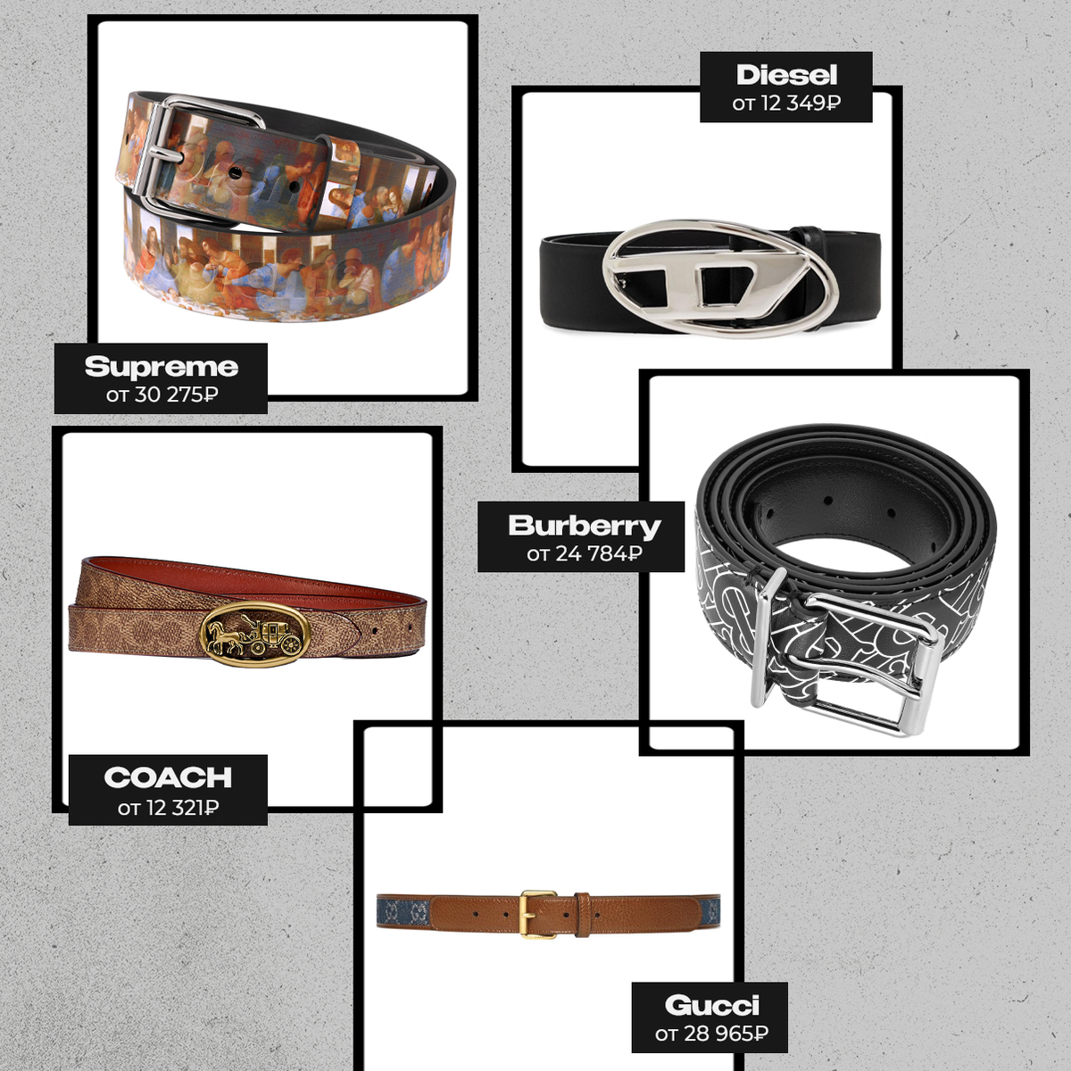 Если уж и брать ремень, то хороший и брендовый. Мы вот как раз такие айтемы и нашли — кайфовые же? Supreme, цена от 30 275₽* Diesel, цена от 12 349₽* COACH, цена от 12 321₽* Burberry, цена от 24 784₽* Gucci, цена от 28 965₽* *стоимость может изменяться в зависимости от курса и размера Больше интересного на нашем сайте POIZON