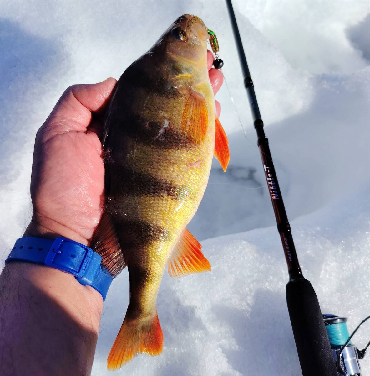 Осенью «закрываться» можно бесконечно долго – в прошлом году речки под лёд ушли только в декабре, так что «закрытий» было штук семь, если не больше. Потом были долгие месяцы борьбы со снегом и льдом. И вот, наконец, речки повсеместно открылись, но «зазор» до начала половодья редко бывает больше двух недель – вот и они пролетели… Джиговая щука зимой порядком надоела. Сильно хотелось какого-нибудь разнообразия, поэтому я взял с собой два спиннинга: джиг-твичевый универсал и ультралайт с тестом до 5 граммов. Первым пытался ловить воблерами. От 65 мм до 110. И снова ни одной поклёвки не увидел. Перешёл на джиг – тут же первая щука «в активе». Вот хоть ты тресни, а не клюёт у меня щука зимой на воблеры. Уже и с маленькими паузами веду, и с большими, и поближе ко дну… За это чуть не поплатился, кстати – воблер засел в какой-то зацеп. Но обошлось: перешёл ниже по течению и, потянув, воблер с зацепа снял. Тогда взялся за ультралайт. В прицеле – джиговые окунь и голавль. Вольфрам 6 граммов, дю