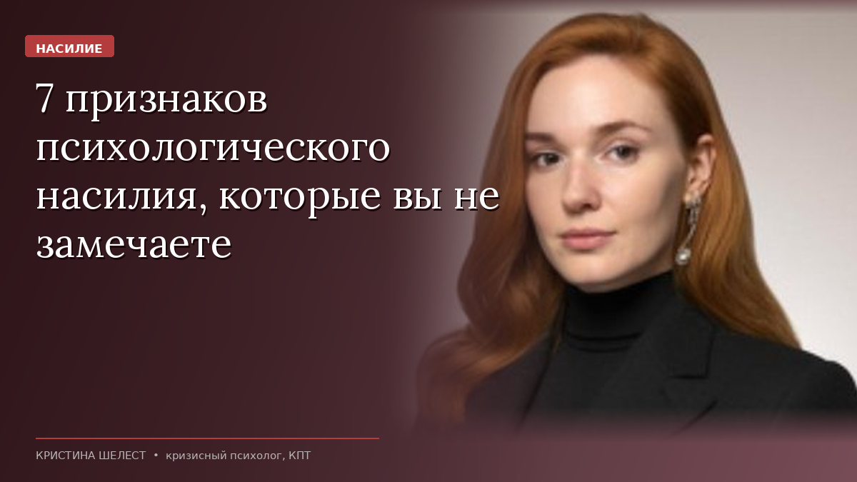 Он не бьёт. Но после каждого разговора вам хуже. Вы думаете, что проблема в вас. Окружающие: «Он хороший, ты преувеличиваешь». И вы сомневаетесь в собственном восприятии. 7 признаков Обесценивание: «Подумаешь, повысили - любой бы мог». Контроль под видом заботы: «Я волнуюсь, когда задерживаешься». Изоляция: постепенное отрезание от близких. Газлайтинг: «Такого не было, тебе показалось». Эмоциональный шантаж: «Если уйдёшь - я покончу с собой». Наказание молчанием: отказ от общения как контроль. Публичное унижение: «шутки» за ваш счёт. Почему жертва не уходит Травматическая привязанность, подорванная самооценка, стыд, страх, отсутствие ресурсов. Это не слабость - это объективная сложность ситуации. Первый шаг - назвать происходящее. Не «сложный характер» - насилие.
