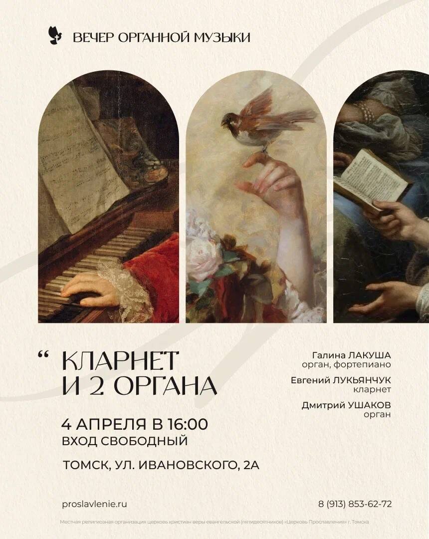 🎹 4 апреля в 16:00 приглашаем вас на необычный музыкальный вечер. Впервые на одной сцене встретятся два органа и кларнет — три голоса, три мастера, одна стихия. Исполнители: 🔸 Галина ЛАКУША (орган, фортепиано) 🔸 Евгений ЛУКЬЯНЧУК (кларнет) 🔸 Дмитрий УШАКОВ (орган) В программе: 🔸 Знаменитая тема Георгия Свиридова «Время, вперёд!» 🔸 Шедевры Баха и Моцарта в неожиданных переложениях 🔸 Редкие сочинения для двух органов и кларнета 🔸 От барокко до современности — музыка на любой вкус 📍 Место: «Церковь Прославления», г. Томск, ул. Ивановского, 2а 👨👩👧👦 Поддержать проведение концертов органной музыки можно добровольным пожертвованием по окончании вечера. • Канал в МАХ • Группа в ВК