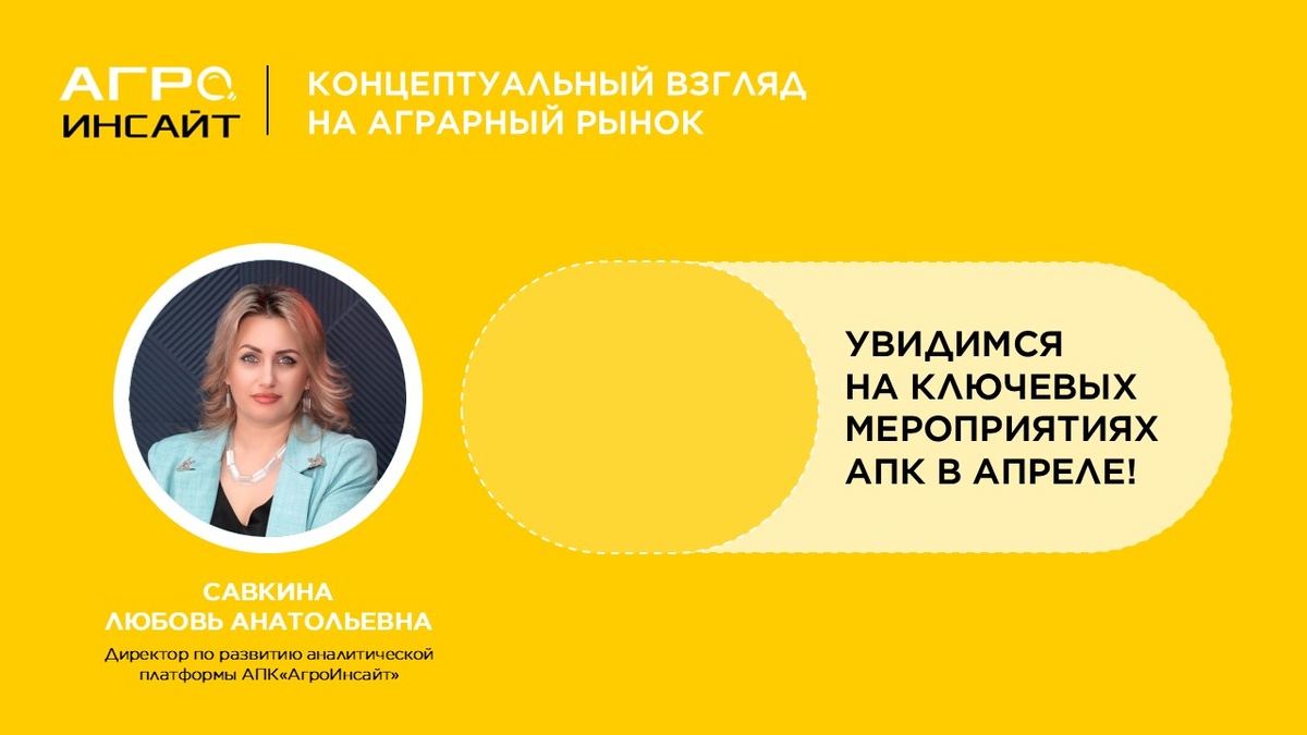 Апрель - месяц активной отраслевой повестки. Аналитическая платформа АПК «АгроИнсайт» принимает участие в ключевых мероприятиях АПК с экспертными выступлениями по рынкам, кормам и биотехнологиям. 🎤 Спикер: Любовь Савкина, директор по развитию «АгроИнсайт» ➡ 14-15 апреля: X Международная конференция «ПроКрахмал 2026: от сырья к биоэкономике» Тема: Ориентир на технологическую трансформацию кормопроизводства. Какой АгроИнсайт окажется решающим для биотехнологического прорыва России? ➡ 16 апреля: XXII конференция «Агроинвестор: PRO животноводство и комбикорма» Тема: Перспективы использования гаприна в кормах для сельскохозяйственных животных, аквакультуры и домашних питомцев ➡ 20-24 апреля: Семинар «Стратегическая отраслевая аналитика в АПК» (ФГБОУ ДПО СПИУПТ) Практика анализа отраслей, построение моделей и подготовка аналитиков для АПК ➡ 22-23 апреля: XX конференция «КОМБИКОРМА – 2026» Тема: Кормовая база и обеспеченность её ключевыми компонентами, в том числе альтернативными источ