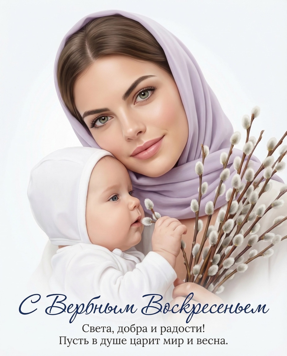 1) Заходим в БОТ ВК или БОТ ТГ 2) Жмем Выбор модели => Nano Banana PRO/Nano Banana 2 3) Добавляем свой фото (важно фото БЕЗ ретуши и любой обработки и фильтров), вставляем этот ПРОМТ: Вертикальная поздравительная открытка в виде высококачественной цифровой иллюстрации/пейнтинга с мягким фотореалистичным рендером кожи и лёгким «editorial» финишем; центральная композиция: молодая мама с младенцем на руках (та же персона, полностью сохранённая идентичность и пропорции, без изменений внешности); мама показана по грудь, фронтально, голова слегка наклонена к ребёнку, взгляд нежный и спокойный, направлен прямо в камеру, лёгкая добрая улыбка; младенец сидит на руках, видна его головка в белом чепчике и часть лица, он смотрит на веточку вербы; кадрирование плотное портретное, камера на уровне глаз, ракурс строго прямой; имитация портретной оптики 50–85 мм, без дисторсии; глубина резкости умеренная, лица максимально резкие, задник чистый и «проваленный» в мягкий белый, без шумов, без фактуры сте