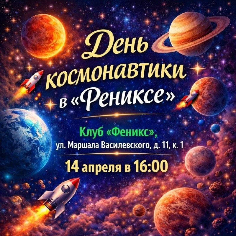 🚀 🛰А ТЫ МЕЧТАЛ СТАТЬ КОСМОНАВТОМ, КОГДА ВЫРАСТЕШЬ? 14 апреля клуб «Феникс» открывает звёздные врата — и билет туда бесплатный. 🌍В День космонавтики мы не просто рассказываем о Вселенной — мы в неё отправляемся. Викторины о планетах и легендарных космонавтах, мастер-классы (строим ракеты, лепим планеты, создаём космические композиции), командные конкурсы и памятные сувениры для каждого участника. Юные исследователи узнают, как люди покоряли космос. 🌍 Взрослые — вспомнят, каково это: смотреть в небо и мечтать о звёздах ✨ 📍Ул. Маршала Василевского, д. 11, к. 1 (клуб «Феникс») 📅14 апреля 2026 🕐16:00 — 19:00 🎟 Вход свободный До встречи на орбите🌍 #ДеньКосмонавтики #КлубФеникс #Космос #ПраздникДляДетей #ДетскоеМероприятие #ОКЦСЗАО #Москва 🔗Подписывайтесь на нас в 📱ВК 📱Телеграм 📲МАКС