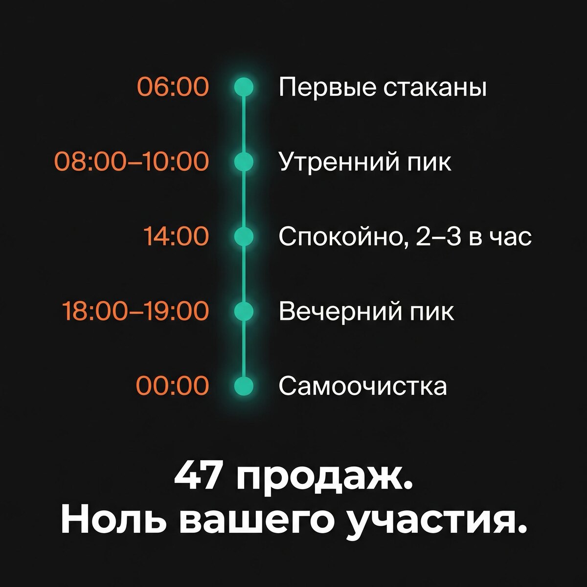 23:12 — последний. Между ними — 47 продаж и ноль Вашего участия. Это один обычный вторник одной обычной точки. Утром, когда офис начинает просыпаться, автомат уже в работе. С 8 до 10 — самый плотный поток: латте, капучино, американо. Люди заходят на автопилоте, пока в голове ещё не включился рабочий режим. Машина не опаздывает, не просит поднять настроение и не требует объяснять, почему сегодня без сахара. К обеду темп немного спадает — 2–3 стакана в час. Ближе к вечеру снова оживление: кто-то берёт последний кофе перед дорогой домой. В полночь — самоочистка по расписанию. Без Вашего участия. Пока всё это происходит, Вы видите в приложении: сколько стаканов продано, какой напиток сегодня в топе, сколько осталось ингредиентов до следующего обслуживания. Не нужно ехать на точку, чтобы это проверить — достаточно открыть телефон. Именно так выглядит бизнес, где Вы не являетесь узким местом. Ставьте 🔥 если хотели бы получать такие уведомления о доходе на телефон, пока занимаетесь св