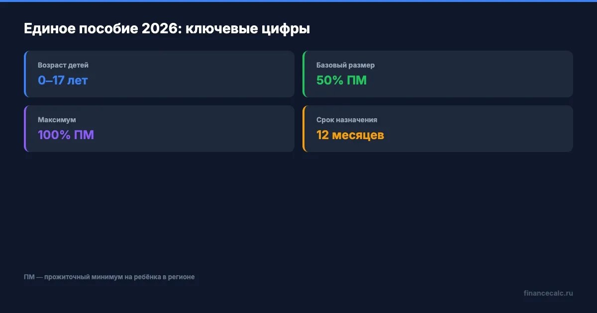 С 2023 года все основные выплаты на детей объединены в одно пособие. Максимальный размер в 2026 году — 16 200 ₽ в месяц на ребёнка, а для московских семей — до 20 000 ₽. Получить его может семья с доходом ниже одного прожиточного минимума на человека. Проверьте, как пособие соотносится с вашим платежом по кредиту, через кредитный калькулятор.