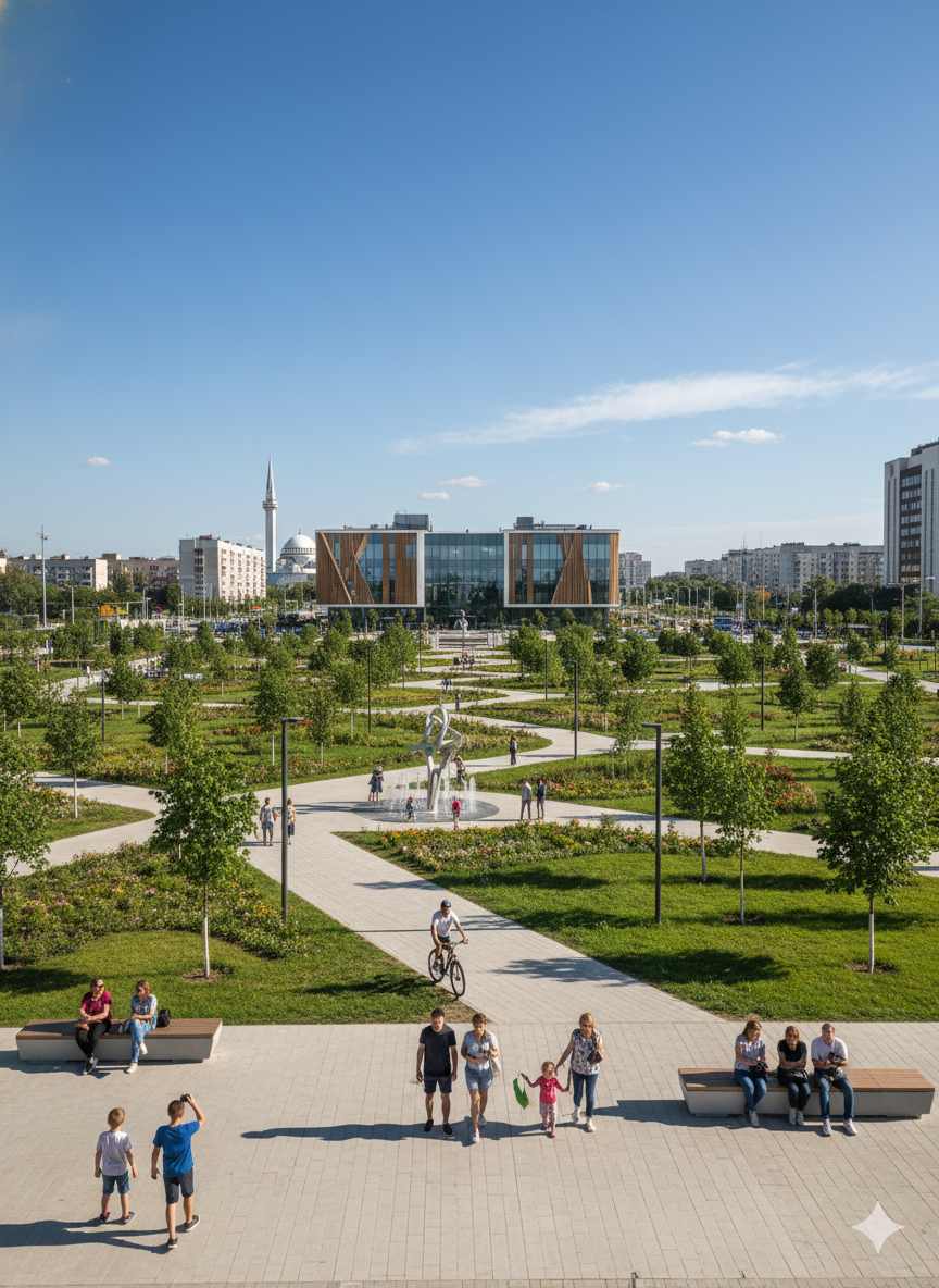 Пешеходный променад — любимое место прогулок альметьевцев всех возрастов: уютная зелёная зона, протянувшаяся через несколько кварталов и наполненная скульптурами, фонтанами и художественной ковкой. Это настоящая живая улица, а не просто тротуар.