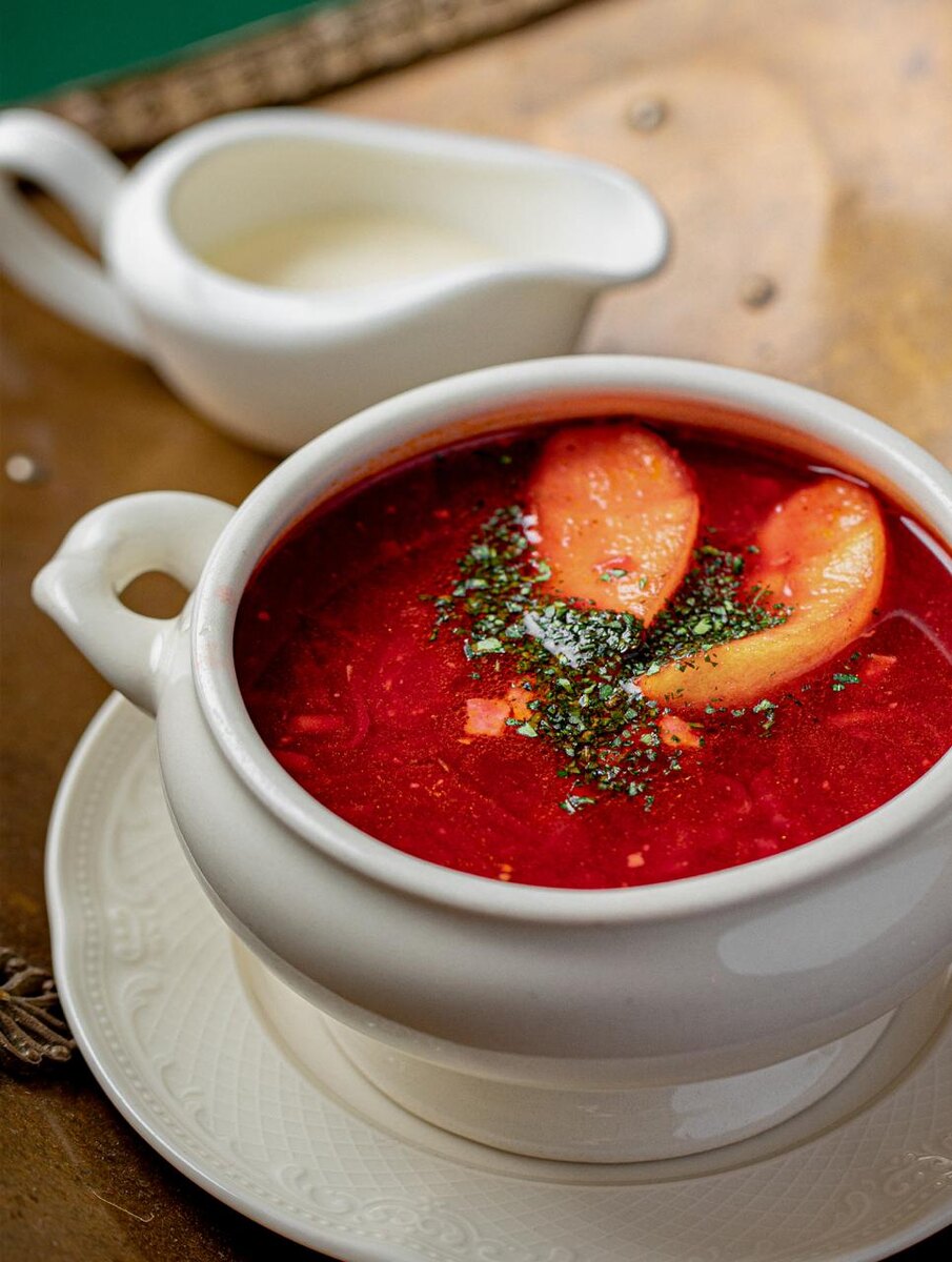 Борщ от Андрея Махова — это куриный бульон, копченая утиная грудка, свежая и квашеная капуста, свекла, морковь, лук и чеснок. Особый вкус придают печеные в меде яблоки. Идеально со сметаной. Забронировать стол вы можете на нашем сайте.