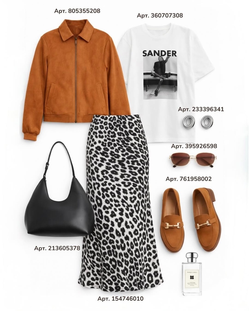 В этом образе особенно красиво соединились характер и утончённость. Куртка задаёт тёплое настроение, юбка становится главным акцентом, светлый верх делает комплект легче, а обувь и аксессуары собирают всё в цельную, дорогую композицию. Ниже — подробный разбор каждой находки строго по порядку, с артикулами, детальным описанием и советами стилиста.
