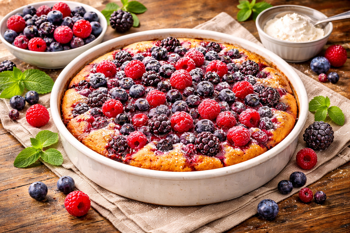 4. Выливаем тесто в форму, посыпаем любыми замороженными ягодами и отправляем в духовку на 45 минут при 180 градусах.