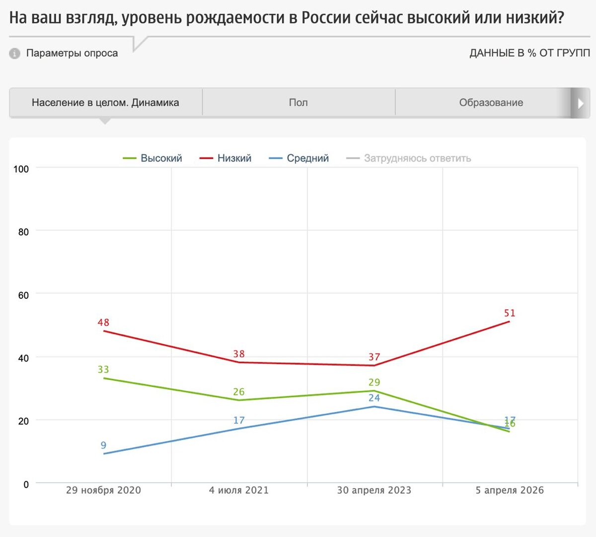 По данным опроса ФОМа, 16% россиян считают, что уровень рождаемости в стране сейчас высокий. Половина опрошенных придерживается противоположного мнения, полагая, что рождаемость низкая. 17% респондентов оценивают ситуацию как среднюю. За последние два-три года 20% участников опроса отметили рост рождаемости, 36% – ее снижение, 18% опрошенных не заметили изменений. Среди необходимых условий для того, чтобы завести ребенка, большинство респондентов выделили наличие стабильного дохода (96%) и собственного жилья (82%). Подробнее: fom.ru #рождаемость #семья #общество 📲 ФОМ в МАХ 💙 ФОМ в ВК 📱 Фонд Общественное Мнение