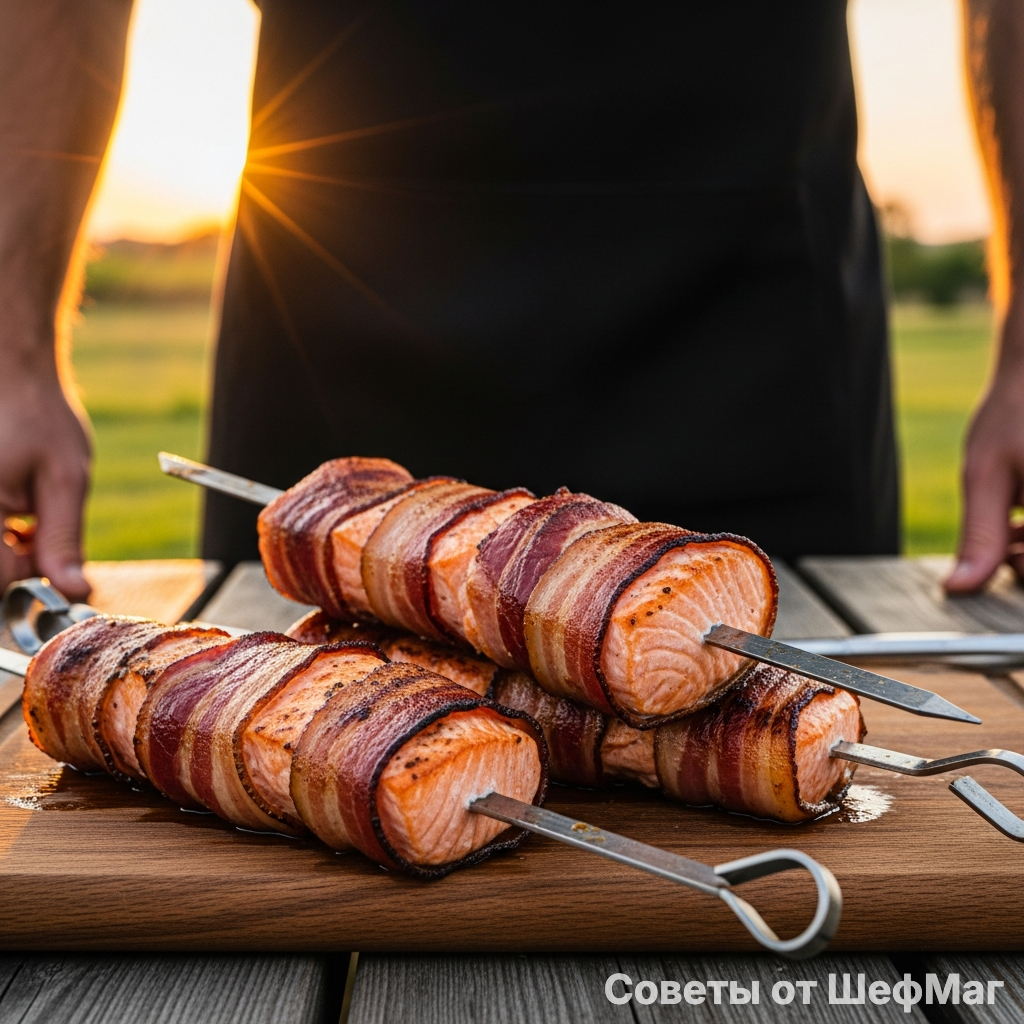 Привет, друзья! Представьте: вечер, золотистые лучи уходящего солнца пробиваются сквозь деревья, а на столе готовится абсолютный шедевр. Сёмга на гриле часто получается сухой, потому что красная рыба не прощает ошибок с температурой. Но сегодня мы используем гениальный кулинарный трюк - обернем нежное рыбное филе в дерзкий, копченый бекон. Этот дуэт навсегда изменит ваше отношение к рыбным шашлыкам! 🐟 Филе сёмги (или форели) без кожи и костей - 600 г; 🥓 Сырокопченый бекон (тонкая нарезка) - 12-15 длинных полосок; 🍋 Лимон (только сок) - 1 ст. л.; 🍯 Жидкий мёд (или кленовый сироп) - 1 ст. л. (для глазури); 🌿 Свежий тимьян - пара веточек; 🧂 Свежемолотый черный перец - по вкусу. КБЖУ на 100 г: Калории - 245 ккал, Белки - 22 г, Жиры - 16 г, Углеводы - 1.5 г. В этом рецепте бекон выступает в роли идеального термоизолятора. Когда шампур попадает на жар, свиной жир начинает медленно плавиться (рендериться). Он обволакивает рыбу, не давая ее собственной влаге испариться. В результате беко