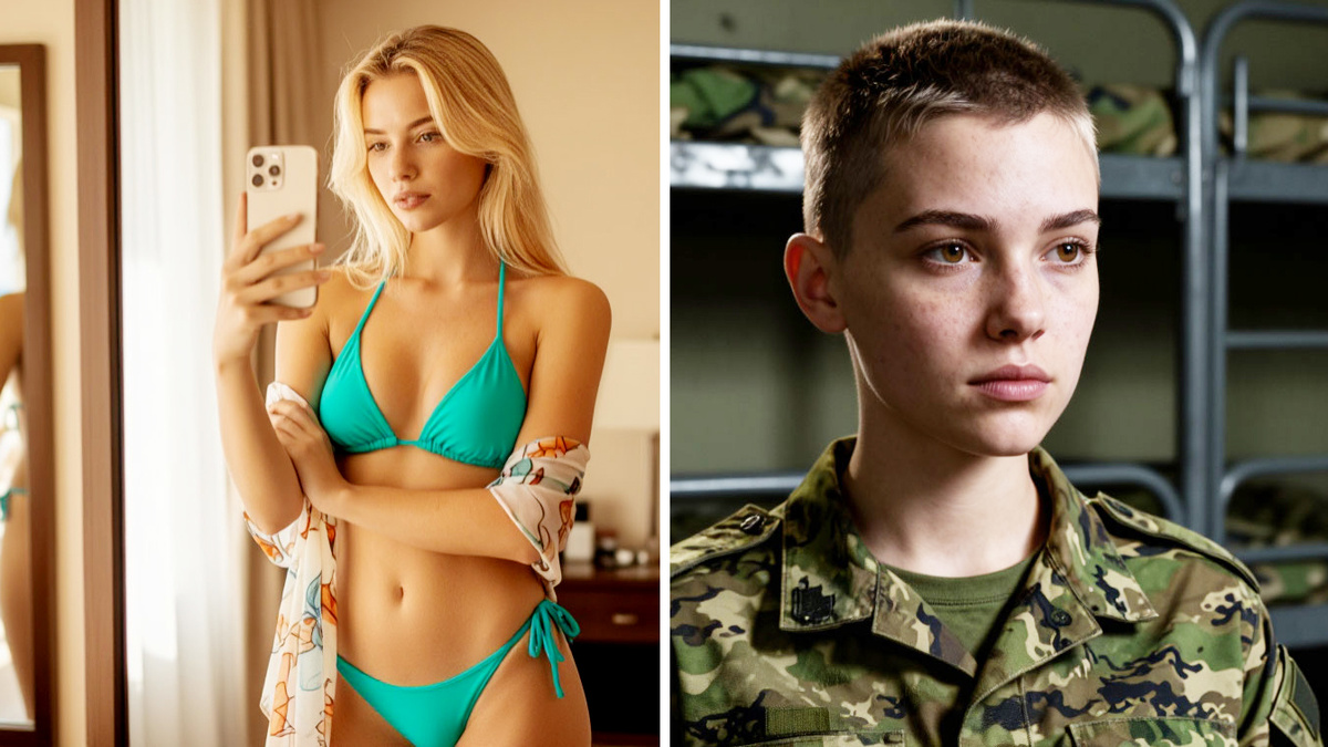 - После. Короткая стрижка «ёжик», камуфляжная форма, никакой косметики.