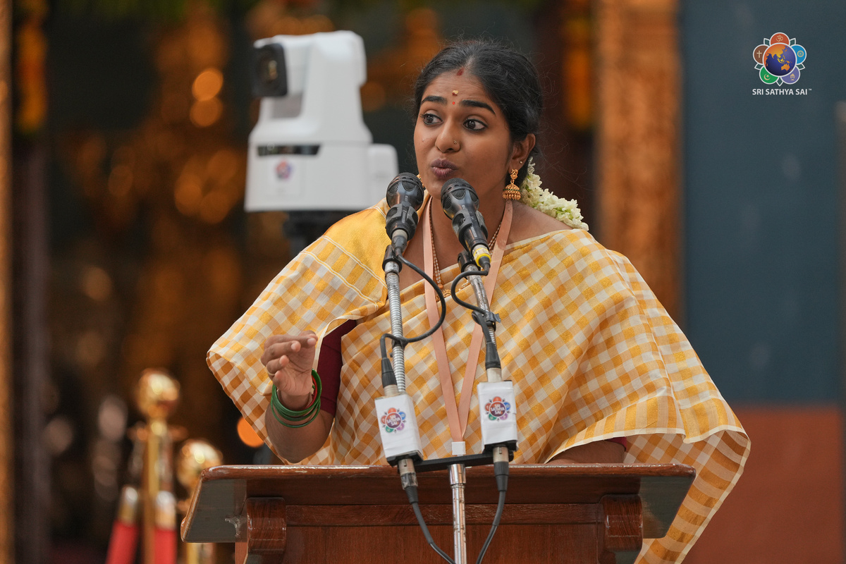 Г-жа Асвати Суреш ("Юные посланники Саи" — женское крыло) вдохновенно объяснила, что Вишу символизирует внутренний восходящий поток любви и бескорыстия. Она подчеркнула, что, чтобы осознать Божественного Шанкару, человек должен стать смиренным Кинкарой (слугой), отметив Севу (бескорыстное служение) как истинный духовный путь. Она призвала каждого поднести своё "Кайнееттам"**, то есть протянуть руку помощи обществу в форме любви и стать смиренными проводниками Божественного послания.