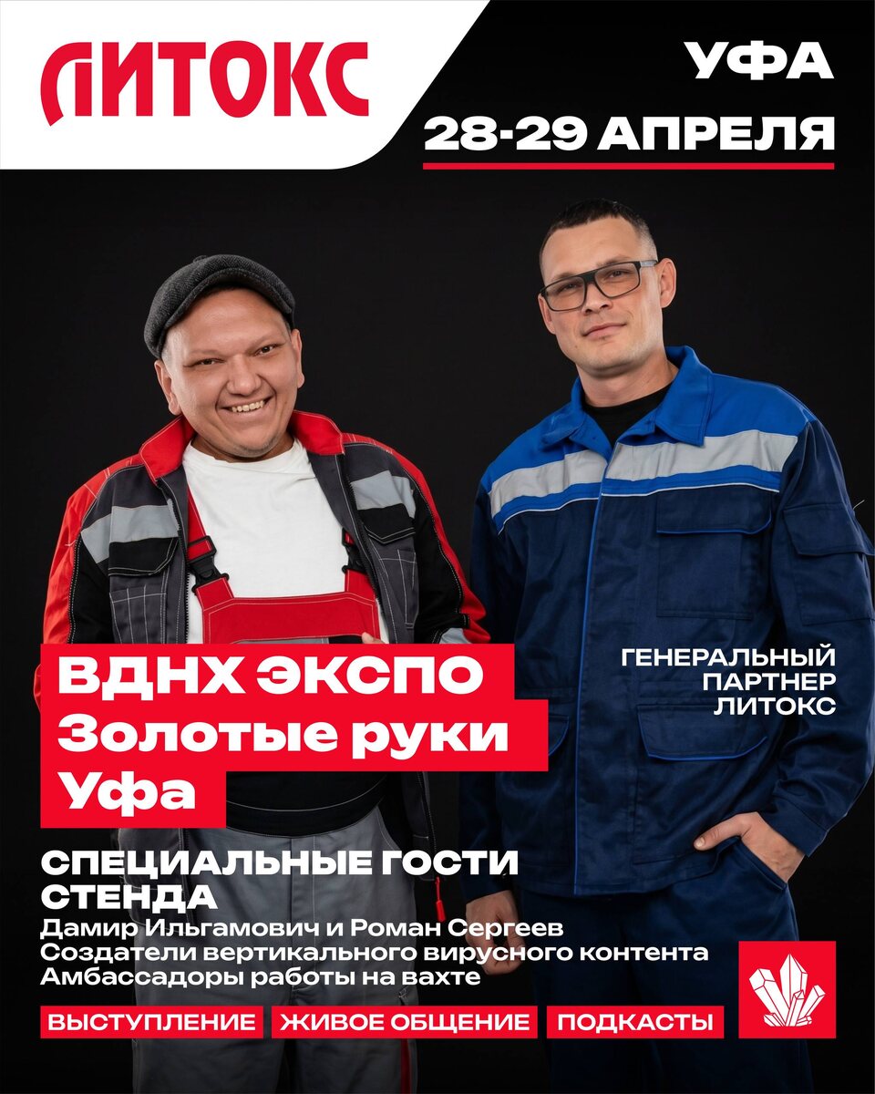 Строительный форум «Золотые руки» пройдёт в Уфе 🔨 28 и 29 апреля в ВДНХ-ЭКСПО (г. Уфа, ул. Менделеева, 158) состоится масштабное событие в сфере отделки и ремонта. 🌟 Специальные гости стенда ЛИТОКС — Дамир Ильгамович и Роман Сергеев Создатели вертикального вирусного контента, амбассадоры работы на вахте. Тема выступления: «Человеку нужен человек. Как создавать контент для людей, а не для алгоритмов» Также на стенде будет работать подкаст-студия. В первый день форума обязательно приходите — оставьте свой след в истории «Золотых рук»! 🎙️ В программе форума: · 📋 Экспертные доклады от лидеров рынка · 👷♂️ Практические мастер-классы от ведущих технологов · ✅ Презентация продуктов и технологий ЛИТОКС и других брендов · 🎁 Яркая программа с конкурсами и розыгрышем ценных призов · 😊 Неформальное общение с коллегами со всей страны Важно: вход на форум бесплатный. Регистрация обязательна по ссылке: https://forum-zolotye-ruki.timepad.ru/event/3810989/#register