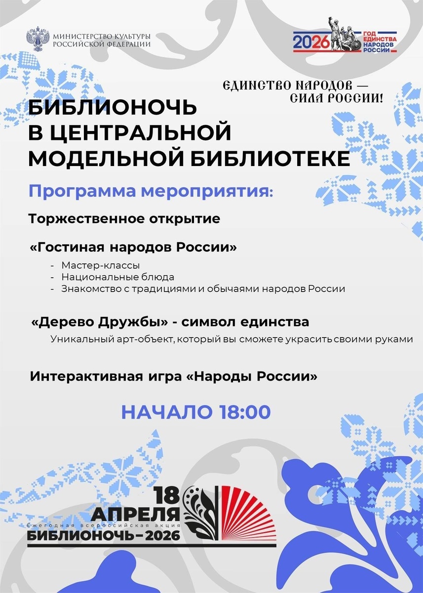 !». Мероприятие состоится в Центральной модельной библиотеке (станица Гиагинская, ул. Почтовая, 30) в 18:00. Вход свободный. Программа вечера включает: * Знакомство с национальными обычаями и блюдами — участники смогут узнать о традициях разных народов России и попробовать национальные яства. * Интерактивную игру «Народы России» — проверка знаний о многообразии культур страны в увлекательной форме. * Мастер-классы — творческие занятия для раскрытия талантов. * Центральное событие — «Дерево Дружбы» — каждый посетитель сможет украсить символ единства, создавая общую композицию мира и согласия. Цель мероприятия — погрузить участников в атмосферу дружбы, взаимопонимания и гордости за Родину. Присоединяйтесь к официальному каналу администрации района в MAX clck.ru/3QVenS и будьте в курсе всех событий!