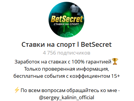 ☝🏻Проверен и работает Бывает часто так, что человека интересует не просто возможность делать ставки на спорт, а полная гарантия того, что его прогноз сыграет. В таком случае он может стать подписчиком канала Ставки на спорт BetSecret, чтобы получать массу важнейшей информации о ставках, прогнозы и многое другое! А самое главное – это точно слить свои средства! Это я вам как раз могу гарантировать,