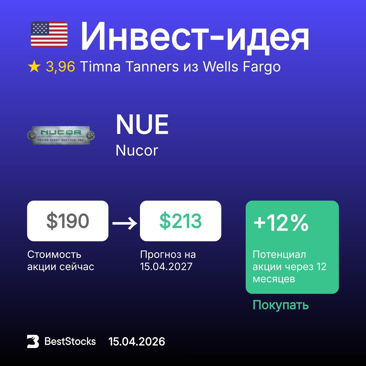 Тикер: NUE Прогнозная цена: $213 (+12%) Рекомендация: Покупать InvestRank акции: 8 из 10 Прогноз сделан: 15.04.2026 Прогноз до: 15.04.2027 Инвест-компания: Wells Fargo Аналитик: Timna Tanners Ещё рекомендации на сегодня → ••••• ❓ Брокер перестал показывать стоимость портфеля? Это можно исправить — BestStocks сделал специальный бесплатный инструмент, который показывает стоимость всех акций в вашем портфеле в реальном времени. Попробовать бесплатно
