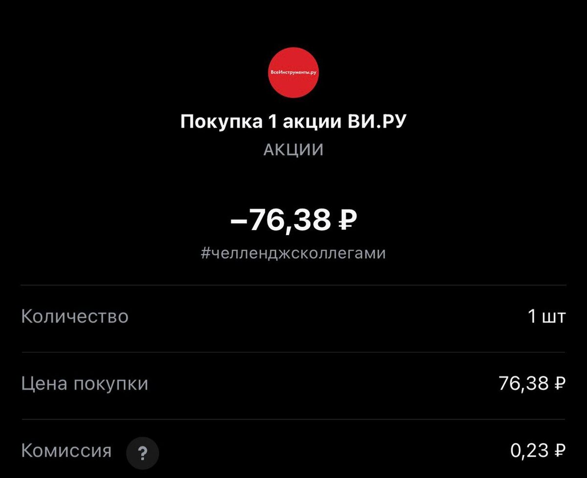 ! Сегодня покупка #397 с учетом оставшихся денег с прошлых сделок. Статистика портфеля на стороннем сервисе, можно посмотреть по "ссылке" Напомню это челлендж с коллегами, каждый рабочий день пополняем брокерский счет на 250 рублей и инвестируем. Если возникли вопросы или есть не понимание, что делать. Задавайте «тут» Покупка #397 🟢 «ВИ.РУ» 76.38 rub #VSEH 1 лот #каждыйсможет #челенджсколлегами TG MAX