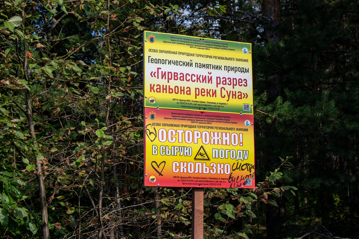 На следующее утро мы отправились смотреть ещё одно интересное место в окрестностях посёлка Гирвас - Гирвасский разрез каньона реки Суна. В предыдущей части я показывала Пионерный канал, прорытый от р. Суна до оз. Пальеозеро в 1930-1940-е годы с целью перенаправить воды Суны к Кондопожской ГЭС. А вот это — старое русло Суны, по которому река текла до постройки канала. Сейчас оно перегорожено плотиной, и воды здесь практически нет, только сочатся сквозь плотину небольшие ручейки. Бурлящий поток, как в старые времена, появляется изредка и ненадолго по весне, когда из водохранилища спускают излишки воды и приоткрывают заслонки плотины.