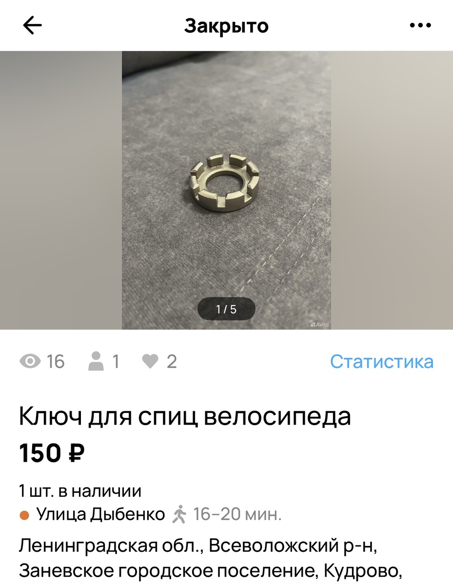 - Первая продажа - это велосипедный ключ для спиц. Перебирая ящик с инструментами, я нашла много всего, чем я не пользуюсь, в том числе и сам ящик мне оказался не нужен. Среди вещей был этот ключ, пользовалась я им один раз и надобности в нём нет. Выставила за символическую цену, забрал подросток лет 12 за 150 рублей.