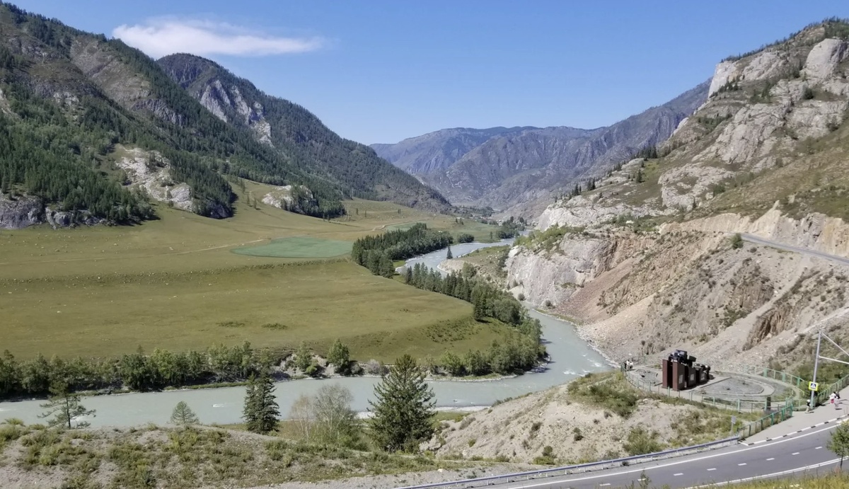 После Усть Семы дорога стала другой, и это чувствуется сразу, так как меньше домов и больше открытых участков. Я стала чаще останавливаться, потому что появляются виды, которые не отмечены на карте, и именно они иногда запоминаются сильнее. Слияние Чуи и Катуни я не пропустила, так как это одна из тех точек, где разница воды видна даже без объяснений.