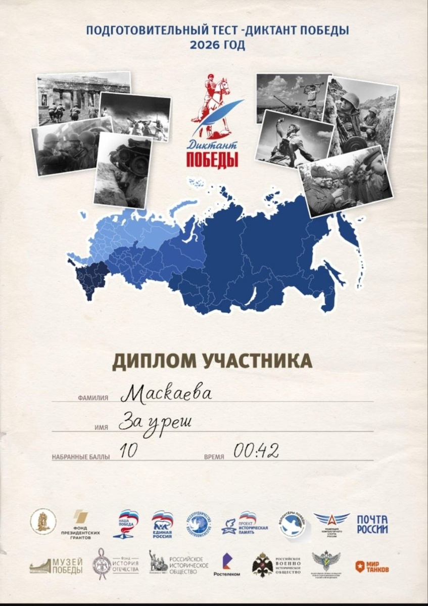 #ДиктантПобеды #Тренировочныйтест 🏆Прошла два тренировочных теста для подготовки к "Диктанту Победы". 🔥Присоединяйтесь и проверьте свои знания. 👇 Тренировочные тесты для подготовки к «Диктанту Победы» доступны на официальном сайте: 👇 диктанты.рф (или dictantpobedy.ru) в разделе «Тесты». Задания разработаны экспертами РИО, включают 10-25 вопросов о ВОВ, а за прохождение можно получить электронный диплом.💪