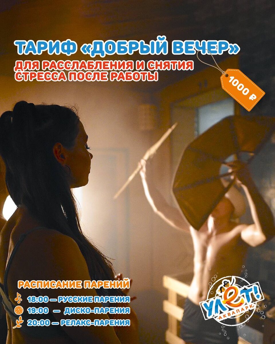 ? 🍋 В «Улёте» знают рецепт восстановления! 🔥 💡 Тариф «Добрый вечер» идеально подходит для того, чтобы снять стресс и зарядиться энергией. 🍃 По вторникам, четвергам и воскресеньям — особенный бонус: коллективные парения с нашим пар-мастером: 🎶 18:00 — Русские парения: душевно, жарко, с ароматом дубовых и еловых веников. 🪩 19:00 — Диско-парения: зажигательная музыка, лёгкий жар, где ритм и атмосфера создают настоящее банное шоу. 🌿 20:00 — Релакс-парения: расслабляющая музыка, дыхательные практики, масла пихты и лаванды. 💡 Тариф «Добрый вечер» — отличный вариант, чтобы завершить день с пользой. 🎫 Стоимость - 1000 ₽ ⏰ Тариф действует с понедельника по четверг с 18:30 🎁 Для малышей до 5 лет вход в аквапарк бесплатный Выбирайте дату и бронируйте билеты на сайте 🎟️ promo.aquaulet.ru 🌐 Наш канал в MAX: https://max.ru/id7300032246_biz 📍 Аквапарк «Улёт», ул. Александровская, 60В #Улёт #Аквапарк #СемейныйОтдых