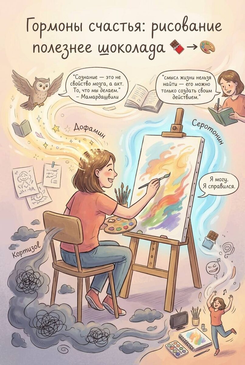 🍫➡️🎨 Вы знаете, что творчество — это зависимость ? Самая легальная и полезная. Давайте без метафор. Вот что происходит в вашем теле, когда вы садитесь рисовать, писать, вышивать или даже просто красиво сервируете завтрак. Что происходит в мозге 🧠 1️⃣. Дофамин. В момент творческого озарения (инсайта) мозг «взрывается» дофамином.Это тот же самый гормон, который выбрасывается при влюблённости и при выигрыше в лотерею. Только в отличие от шопинга или сладкого, этот дофамин закрепляет здоровое поведение, а не разрушительное . 2️⃣. Серотонин. Когда вы доводите дело до конца (даже маленькую зарисовку), уровень серотонина — гормона спокойствия и уверенности — растёт. Вы чувствуете: «Я могу. Я справился» . 3️⃣. Снижение кортизола. Творчество — лучший антистресс. Уровень кортизола (гормона тревоги) падает уже через 20 минут после начала любого креативного занятия . Что говорят мудрецы 🦉 📖 Мераб Мамардашвили, выдающийся философ, говорил: «Сознание — это не свойство мозга, а акт. То, чт