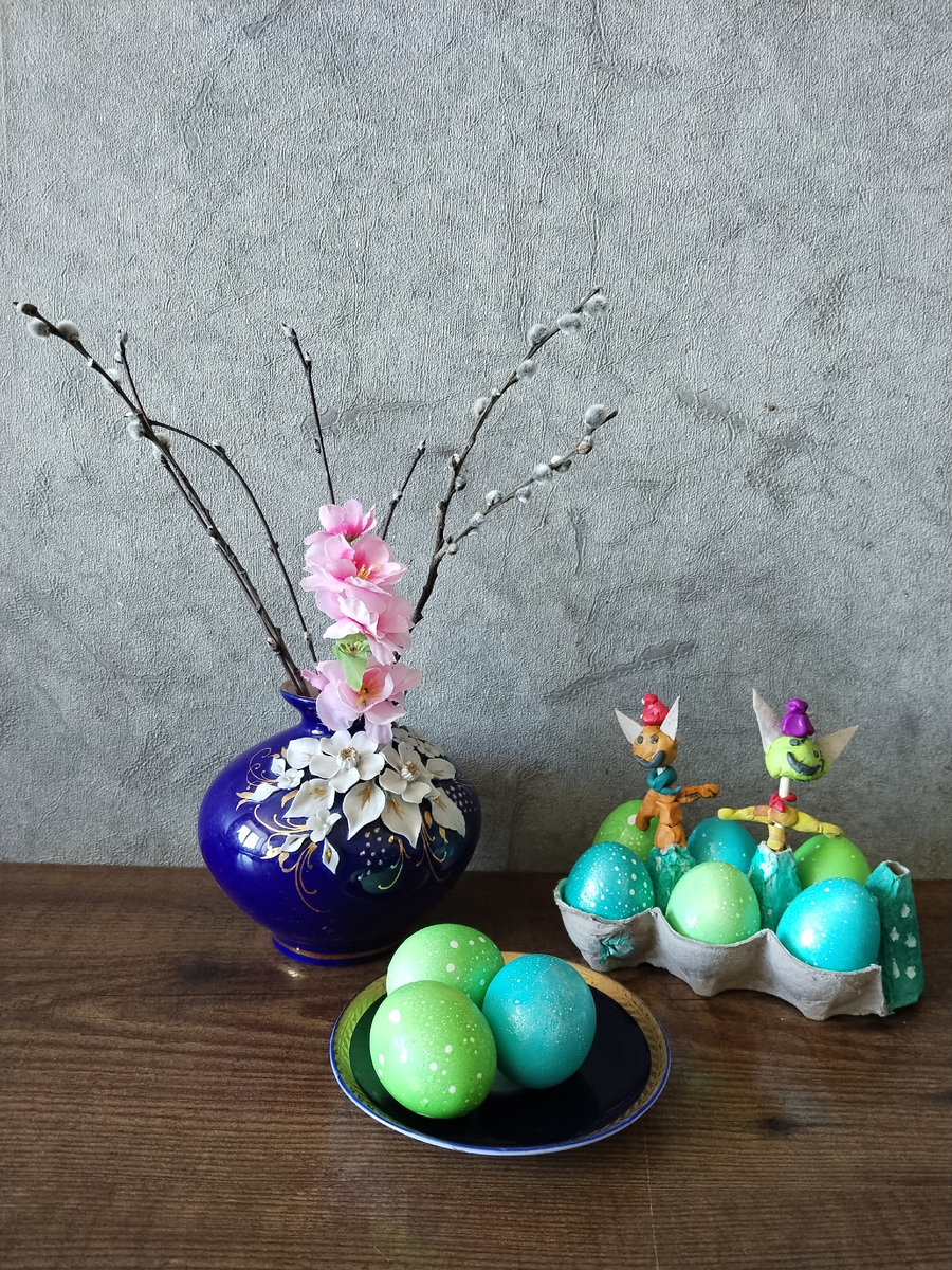 — Петя, мне нужна твоя помощь. Я нашла очень красивую поделку, куда можно положить крашенные яйца. Давай сделаем? Иди пока посмотри видео. Пока Петя вникал в процесс создания поделки из-под лотка для яиц, искал гуашь, кисточки и пластилин, я решила испробовать новый способ покраски яиц к Пасхе. В этот раз он мне попадался слишком часто. Все просто: в горячую воду добавить краситель, 2 столовые ложки уксуса и размешать, отваренные яйца смазать растительным маслом и опустить в воду. Спустя час достать и вуаля – у вас яйца–мухоморы. С прошлого года у меня осталось немного краски – зеленой и синей. Вышло очень красиво — Петя, давай я пока покрашу, а ты сделаешь зайчиков из пластилина. Зайчики правда у нас трансформировались в процессе в котиков, которые стали очень похожи на Карамельку и Коржика из «Три кота». Алиса тоже помогала раскрашивать. Вот такое совместное творчество получилось.