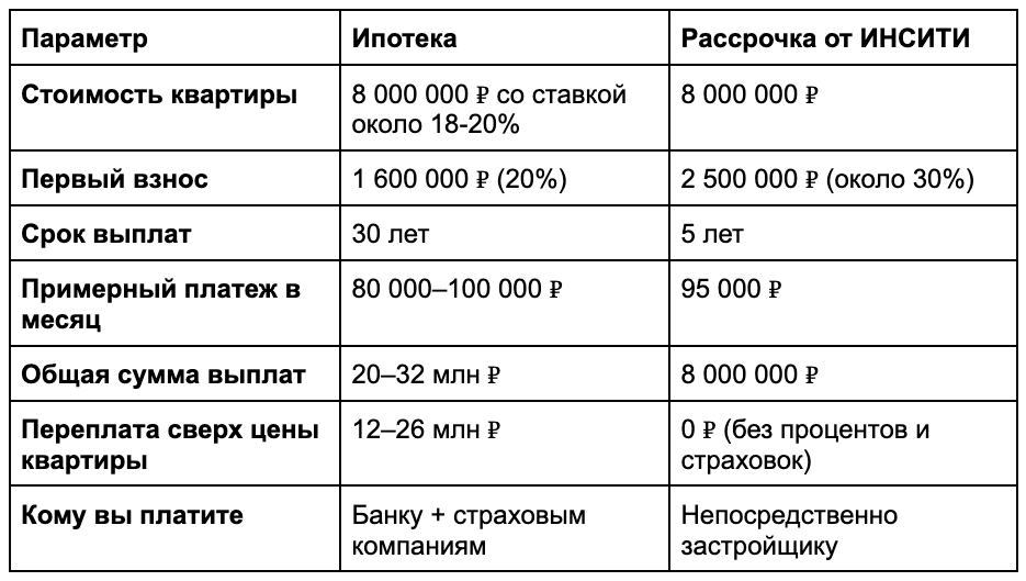 Вы платите только за стоимость квартиры без банковских процентов и обязательных страховок. Срок обычно короче, чем по ипотеке, например до 3–5 лет, поэтому долг не превращается в проект на полжизни, а переплата либо минимальная, либо отсутствует вовсе. Условия фиксируются в договоре с застройщиком, и при досрочном погашении вы не теряете деньги на комиссиях.