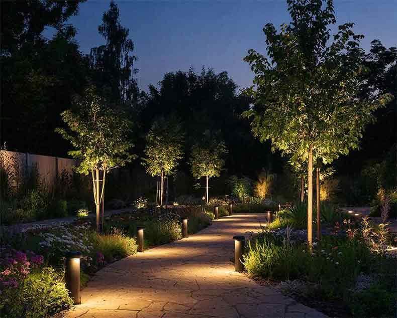 Зональная подсветка дорожек и клумб строится по правилу «меньше — точнее». Парадная зона требует ровного, тёплого свечения (2700–3000 К) на уровне колен. Столбики 60–80 см решают задачу без перегруза.