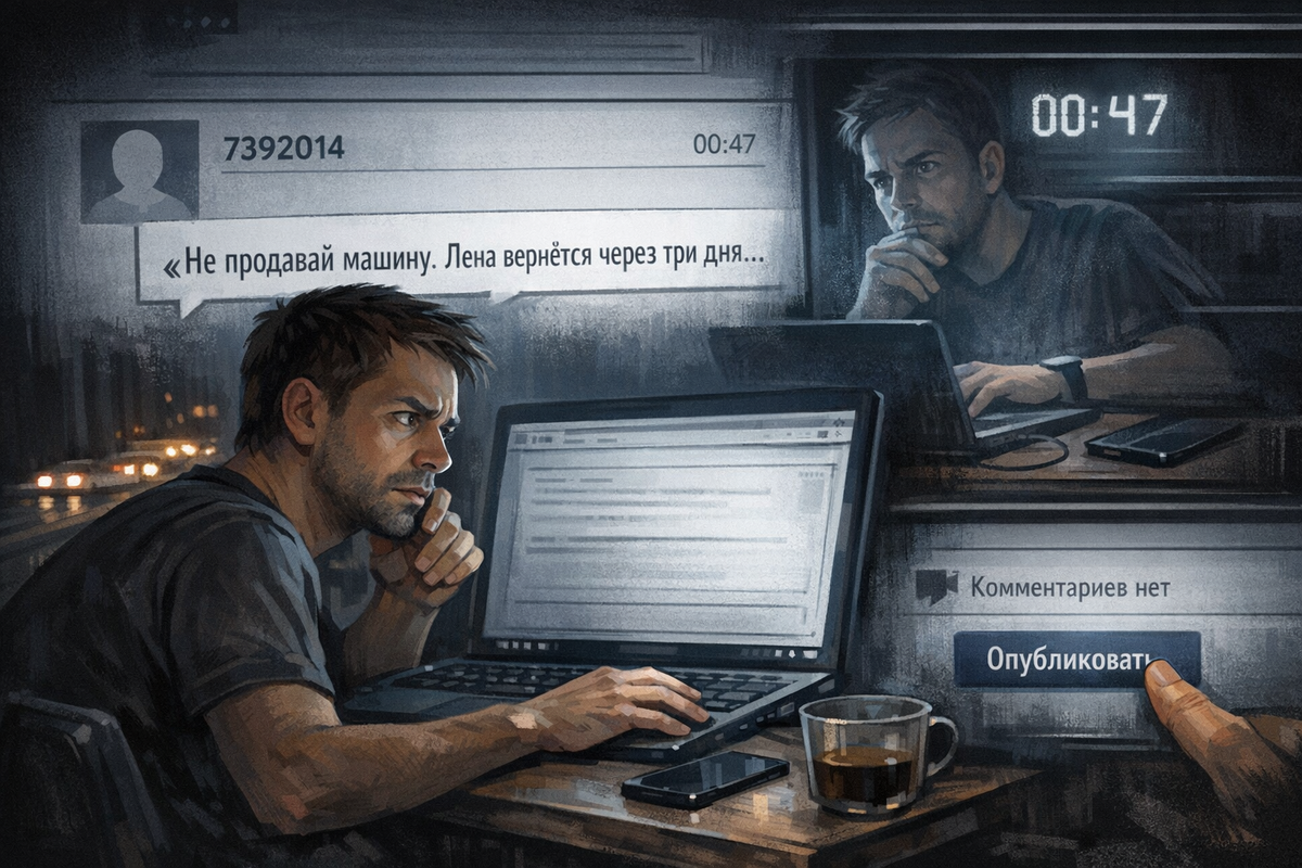 Я дописывал пост про тест-драйв, когда увидел его. Комментарий под постом, которого я ещё не опубликовал. Там было написано: «Не продавай машину. Лена вернётся через три дня». Лена — моя бывшая. Которую я ни разу не упоминал в блоге. ----- Я перечитал это три раза. Лена. Моя бывшая. Мы расстались четыре месяца назад, и я ни разу — слышите? — ни разу не упоминал её в блоге. Ни в одном посте. Ни в одном комментарии. Для интернета её не существовало. А ещё я действительно думал продать машину. Вчера. Лежал на диване, листал Авито и прикидывал, сколько дадут за мою Cerato. Но я об этом никому не говорил. Даже маме. Первым делом я проверил профиль комментатора. Аватарка — серый силуэт. Имя — просто цифры. 7392014. Ни одного поста. Ни одного подписчика. Ни одной подписки. Аккаунт-призрак. Я усмехнулся. Тролль. Или бот. Или тот самый момент, когда алгоритмы Дзена становятся слишком умными. Мало ли что они там собирают — историю поиска, геолокацию. Наверное, просто совпадение. Крупное, наглое