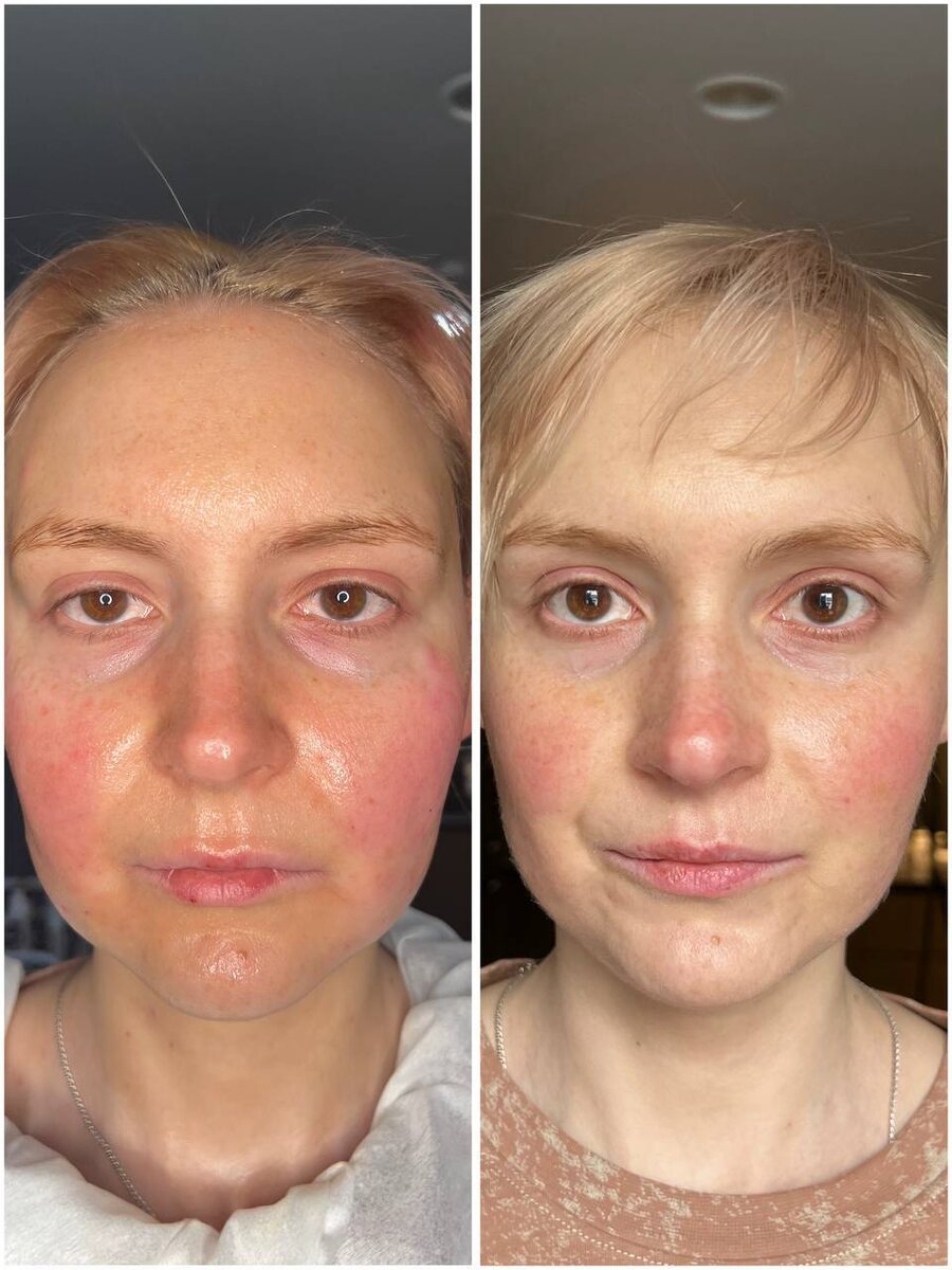 » ☝🏻 Слова пациентки после всего одной патогенетической процедуры Пока в комментариях разрываются от эмоций «Мы не хотим вникать в чувства людей с розацеа, нам нужны только яркие фото До/После», наши пациенты получают результаты, которые не передать визуально Их ощущаешь каждой клеткой кожи 🤗 И слава Богу, что есть масса людей, которые не ждут, когда лица превратятся в мясо Они на ранних этапах проходят лечение, тем самым упрощают жизнь: терапия проходит быстрее, бюджетнее и легче 🧡 А самое главное — не загоняют себя в психоэмоциальную яму от болезни, теряя самое драгоценное Всё же розацеа мучила пациентку: постоянным жжением, отёком, краснотой💢 И это на ретиноидах Мы уже много раз видели истории пациентов на них и знаем, что они не лечат, а лишь на время приглушают симптомы 🤷🏼♀️ Или, как в данном случае, ретиноиды не дали даже этого 👩🏻 Пациентка приезжает из Тулы У нас промежуточный результат Она очень дисциплинированно следует графику лечения и применению домашн