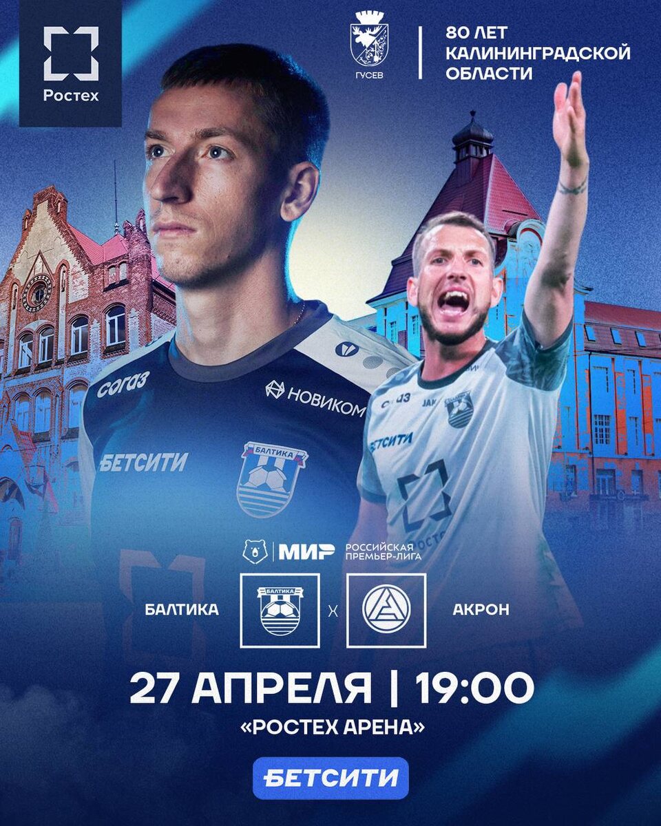 Свой следующий домашний матч Балтийцы проведут 27 апреля против «Акрона». В этом сезоне команды встречались трижды. В первой игре Кубка России мы уступили со счётом 1:2. Во второй встрече, уже в РПЛ, одержали уверенную победу — 2:0: на второй минуте после розыгрыша стандарта отличился Кевин Андраде, а затем наше преимущество укрепил Максим Петров. Третья игра прошла в Калининграде — это был ответный матч группового этапа Кубка России, где мы разгромили тольяттинцев со счётом 3:0. 📆 27 апреля (понедельник) ⏰ 19:00 🏟️ «Ростех Арена» 🎟️ Билеты уже в продаже Вперед, Балтийцы! 🌊 ⚠️ Для посещения матчей Мир РПЛ необходима карта болельщика.