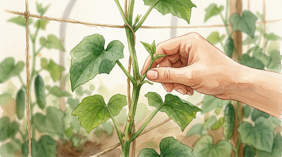 Огурец без формирования — это буйные плети во все стороны, красивая зелень и скромный урожай. С правильным формированием — компактный куст, хорошее проветривание и плоды в нужном месте. Разбираем схемы для разных условий. Если не вмешиваться, огурец пускает силы на рост главного стебля и боковых плетей. Плодоносить начинают боковые ветки, и чем раньше они появятся и чем быстрее будут нагружены плодами — тем лучше. В теплице огурцы ведут вертикально — это позволяет разместить больше растений на меньшей площади и облегчить проветривание. В открытом грунте — горизонтально по земле или по шпалере, прищипывая главный стебель. Это основная схема для большинства партенокарпических гибридов (самоопыляемых). До 5-го настоящего листа удалите все боковые побеги и цветки. Это называется «ослеплением». Цель — не дать растению тратить силы внизу и улучшить циркуляцию воздуха у основания куста, где чаще всего заводятся гнили. В этой зоне оставляйте боковые плети, но прищипывайте их после 1 листа и 1