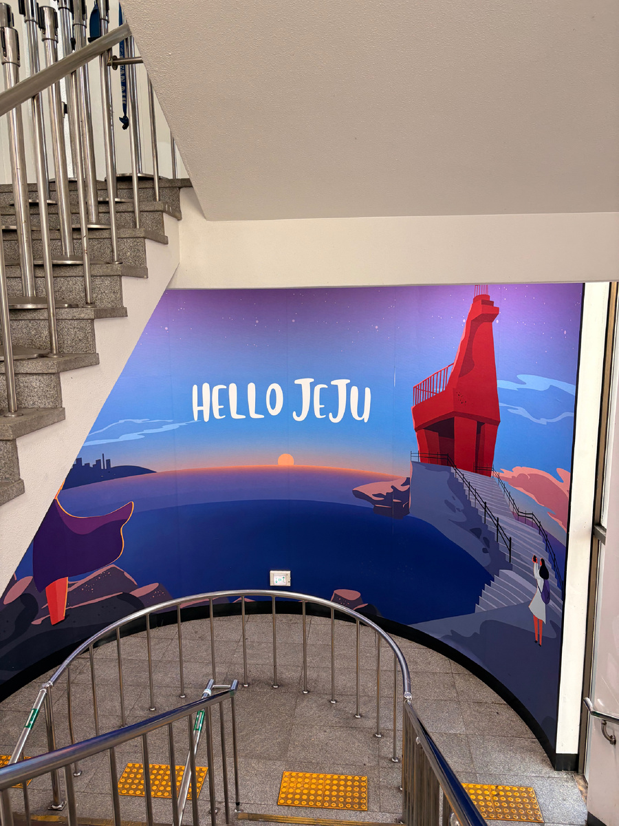 Кстати, лететь на Чеджу из Сеула – одно удовольствие. Авиакомпания Jeju Air летает из маленького уютного аэропорта Кимпхо – очень быстро, меньше часа, очень комфортно. Сам аэропорт Чеджу тоже классный: маленький, компактный, в едальнях цены разумные. Нам всё понравилось.