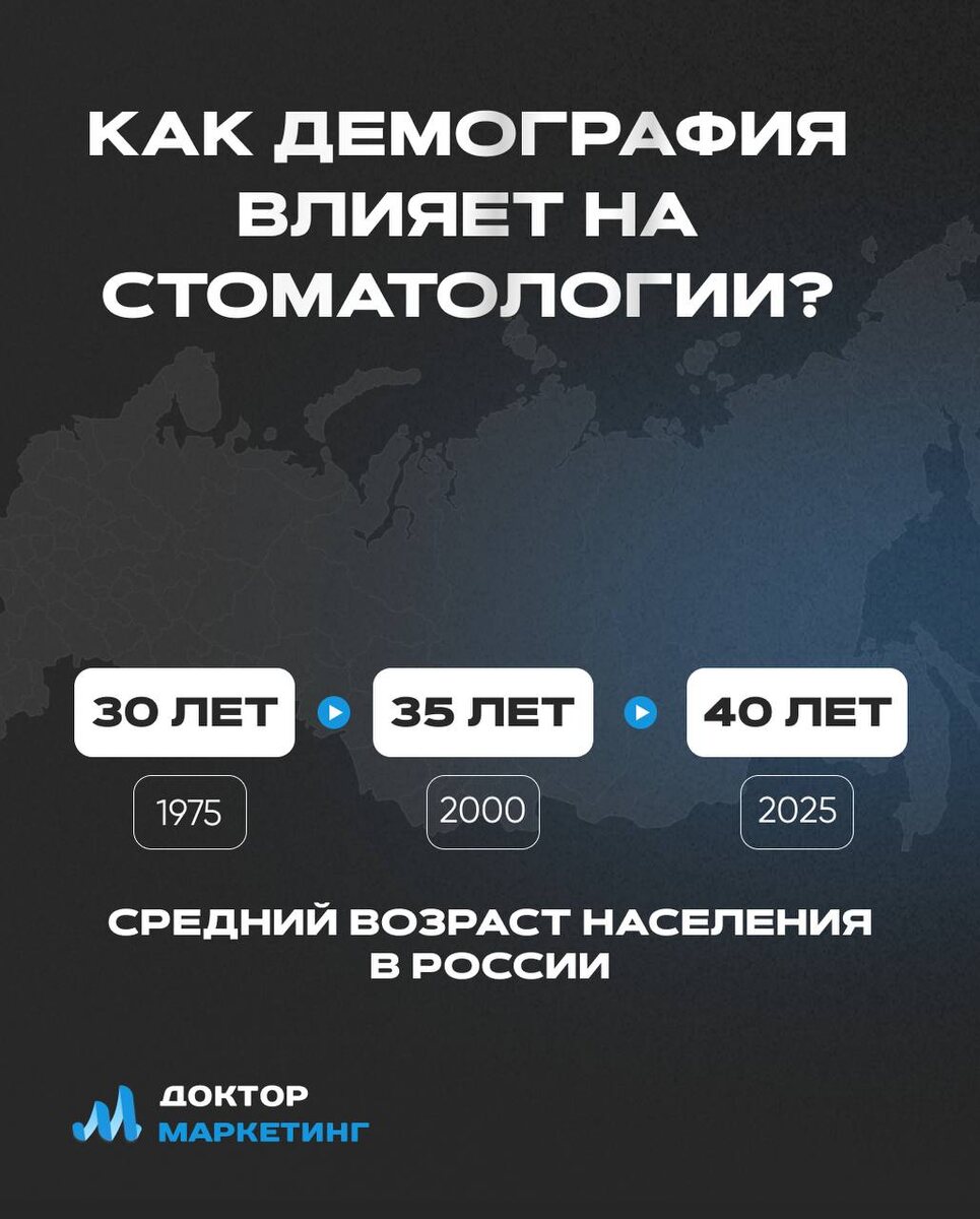 Один из самых сильных драйверов - демография Россия быстро стареет. И именно это делает стоматологию устойчивым бизнесом даже в кризис. Если смотреть на цифры, становится понятно, почему спрос на лечение, имплантацию и ортодонтию будет расти ещё много лет. ℹ️ Население России стареет быстрее, чем кажется По демографическим данным: • средний возраст в России уже около 40-41 года • доля людей старше 65 лет - около 15-16% населения • доля старше трудоспособного возраста - почти 26% • к 2050 году каждый пятый россиянин будет старше 65 лет При этом рождаемость остаётся низкой: • коэффициент рождаемости около 1,3–1,5 ребёнка на женщину • это заметно ниже уровня воспроизводства населения - 2,1 Из этого следует простая вещь: молодых становится меньше, людей старшего возраста больше, потребность в медицине растёт ❓ Почему старение напрямую увеличивает спрос на стоматологию? С возрастом резко растёт количество стоматологических проблем. После 40-45 лет чаще появляются: • потеря зубов •