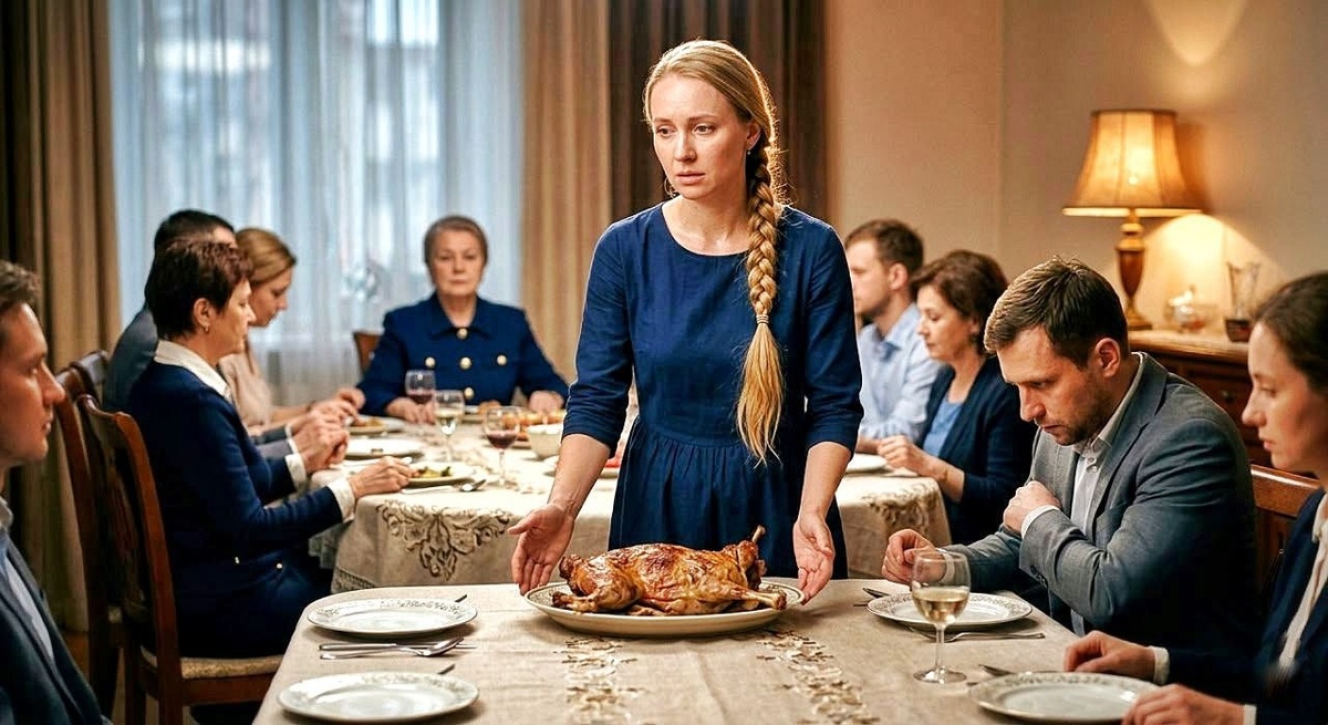 Лена стояла с пустыми руками посреди чужой столовой. Гости смотрели кто в тарелку, кто в окно, кто изучал вдруг ставший интересным рисунок на скатерти.