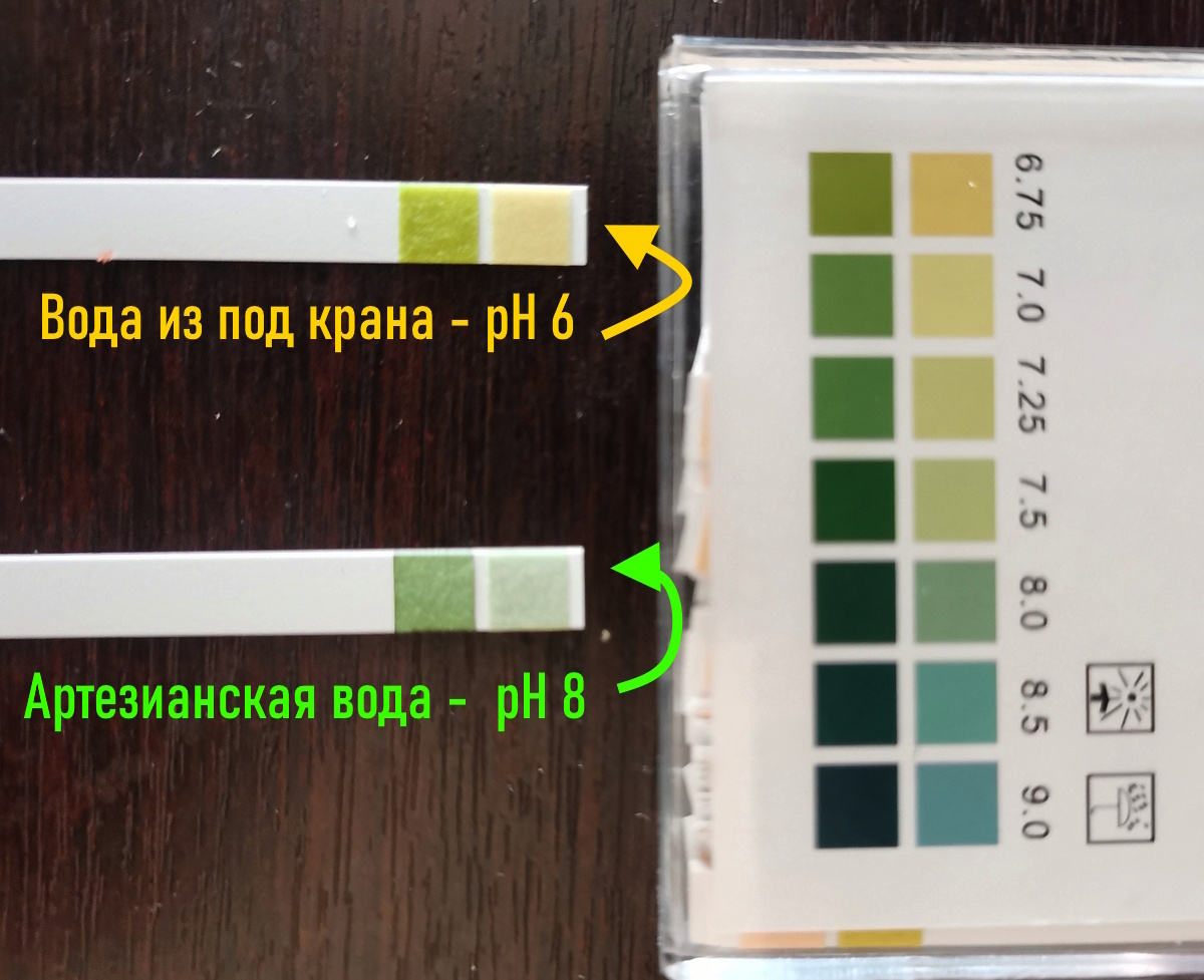 Простой эксперимент: лакмус №1 — это обычная водопроводная вода, лакмус №2 — это артезианская вода, которую добывают на глубине и продают в киосках. Кислотность водопроводной воды составляет pH 6,0–6,5. А кислотность артезианской воды составляет почти pH 8. Это кардинально огромное различие: артезианская вода — щёлочная. Напомню, почему это так важно. Закисление организма — это не миф и не альтернативная медицина. Это доказанный факт: в полости рта кариозные бактерии размножаются только в кислой среде, в щелочной они не размножаются. Бактерии Streptococcus mutans поедают сахар и крахмал и выделяют кислоту, которая разрушает эмаль. То есть, чтобы зубы не разрушались, во рту должна быть именно щелочная среда. Поэтому после приёма пищи рекомендуют попить молока, съесть кусочек сыра или прополоскать (на крайний случай) раствором соды. Щелочная среда восстанавливает зубы и насыщает их минералами: фосфором, фтором, кальцием. А кислотная среда вытягивает из зубов фтор, кальций, фосфор — то