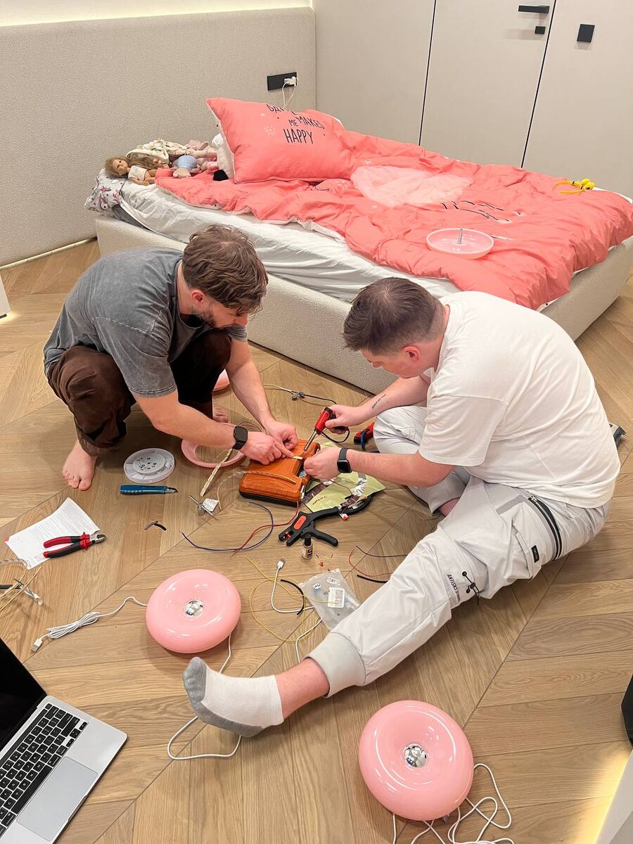 Изначально было куплено 4 светильника. Один из них можно заряжать и тапать по центру, при этом светильник меняет цвета. Еще три светильника были куплены с проводами. Клиент захотел, чтобы ими можно было управлять. Изначально мы планировали просто подать стабильные 5 В, но, как я и думал, после отключения питания они не включались обратно, и пришлось бы включать каждый вручную. Поэтому вместо 5 В мы подали 24 В, обмотали штатную плату светильника светодиодной лентой и подключили её. Причем ленту наклеили ту, которую мебельщики хотели отправить в утиль. Осталась гора мелких обрезков, которые пристроили вот таким образом. Получился шикарный ночник. Вместо стандартного включения-выключения мы реализовали возможность диммирования, что как нельзя кстати положительно отразилось на сценариях освещения в данной комнате. Но самое главное, это счастливый ребенок, который был рад от того, что в его комнате есть прекрасные розовые светильники🩷