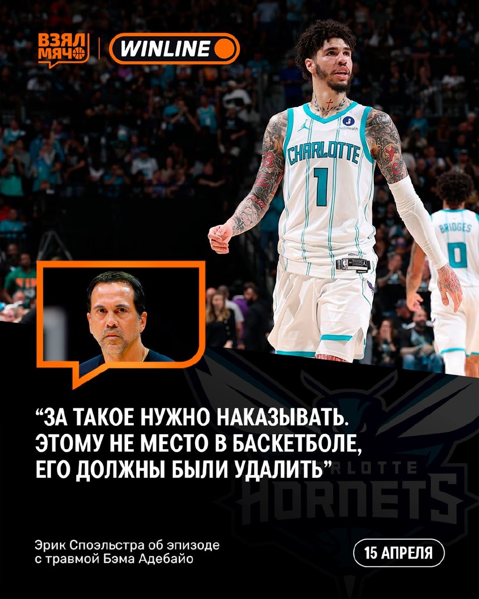 Главный тренер «Майами» прокомментировал эпизод, в котором Бэм Адебайо получил травму спины. 🗣 «Я не считаю это милым или смешным. Это глупый и опасный эпизод. Наш лучший игрок выбыл — но я не ищу оправданий. “Шарлотт” отлично сыграли в концовке, у нас были шансы победить. Но это позорный момент. За такое нужно наказывать. Этому не место в баскетболе — хватать за ноги, устраивать подобные вещи. Кто-то должен был это увидеть. Его должны были удалить. В этой игре нет места таким эпизодам». Согласны? 🏀 ПОДПИШИСЬ — ЗДЕСЬ ЖИВЁТ БАСКЕТБОЛ!