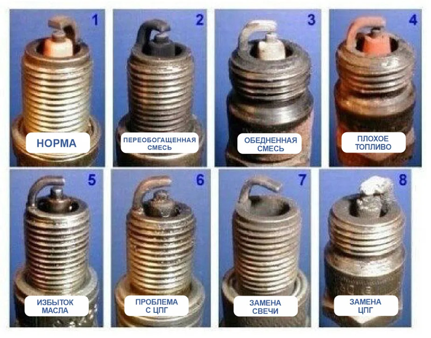При проведении ТО (10-15 тыс. км) следует вывернуть свечу и визуально проверить наличие нагара и его цвет на электродах, щупом проверить зазор, обычно это размер 0.7-0.8 мм. Цвет нагара говорит о техническом состоянии двигателя и процессе сгорания топливной смеси. Поводом для замены служат: Менять свечи нужно сразу все, при износе электродов или увеличении зазора на старых свечах между ними нарушается искр
