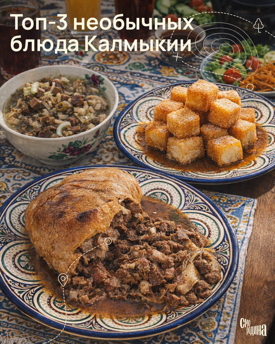 Калмыцкая кухня – одна из самых необычных в России. Суп из бараньих потрохов, баранина, приготовленная в собственном желудке, а на десерт – жареное молоко со специями. Читайте о трех самых интересных блюдах региона. Дотур – калмыцкое блюдо, которое представляет собой суп, приготовленный на основе бараньих потрохов. Его можно назвать главным национальным блюдом региона. Обычно в его состав входят почки, легкие, печень, кишки, рубец. Также в угощение иногда добавляют кровь, молоко, соль и внутреннее сало. Подают различными способами: горкой на тарелке, в виде супа или с домашней лапшой. Кюр – калмыцкое национальное блюдо, которое готовится не на плите и не в духовке: бараний желудок, начиненный его же мясом, запекают в земле. Барашек в собственном желудке помещается в специальную яму, засыпается глиной и томится в этой печке почти сутки. Это сытное блюдо изобрели чабаны, нуждавшиеся в простом и сытном приеме пищи во время выпаса скота в суровых условиях. Национальный десерт калмыцкой кух