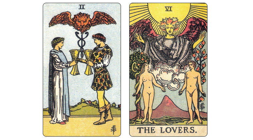 Двойка Кубков – понятная, в целом, карта, олицетворяющая счастливый союз, гармоничное взаимодействие. Но чем она отличается от карты Влюбленные, которая имеет аналогичные значения? Отличия есть, и нужно их понимать, если хотите трактовать карты не просто в контексте «хорошо-плохо», но и учитывать нюансы. Но сначала основные значения Двойки Кубков разберем, а потом будем сравнивать два этих аркана. На обеих картах изображены мужчина и женщина, и некая высшая сила (архангел на Влюбленных, и кадуцей с головой льва на Двойке Кубков). Мужчина и женщина на аркане Влюбленных обнажены, стоят вполоборота друг к другу, но друг на друга не смотрят. Женщина смотрит вверх, на Архангел, словно испрашивая у него совета или благословения. А мужчина вроде как в сторону женщины смотрит, но не прямо на нее. И как будто он тоже в ожидании находится, то ли знака свыше ждет, то ли ответа женщины, то ли не может понять, что с ним происходит. И, похоже, что оба они несколько растеряны, как будто бы и не план