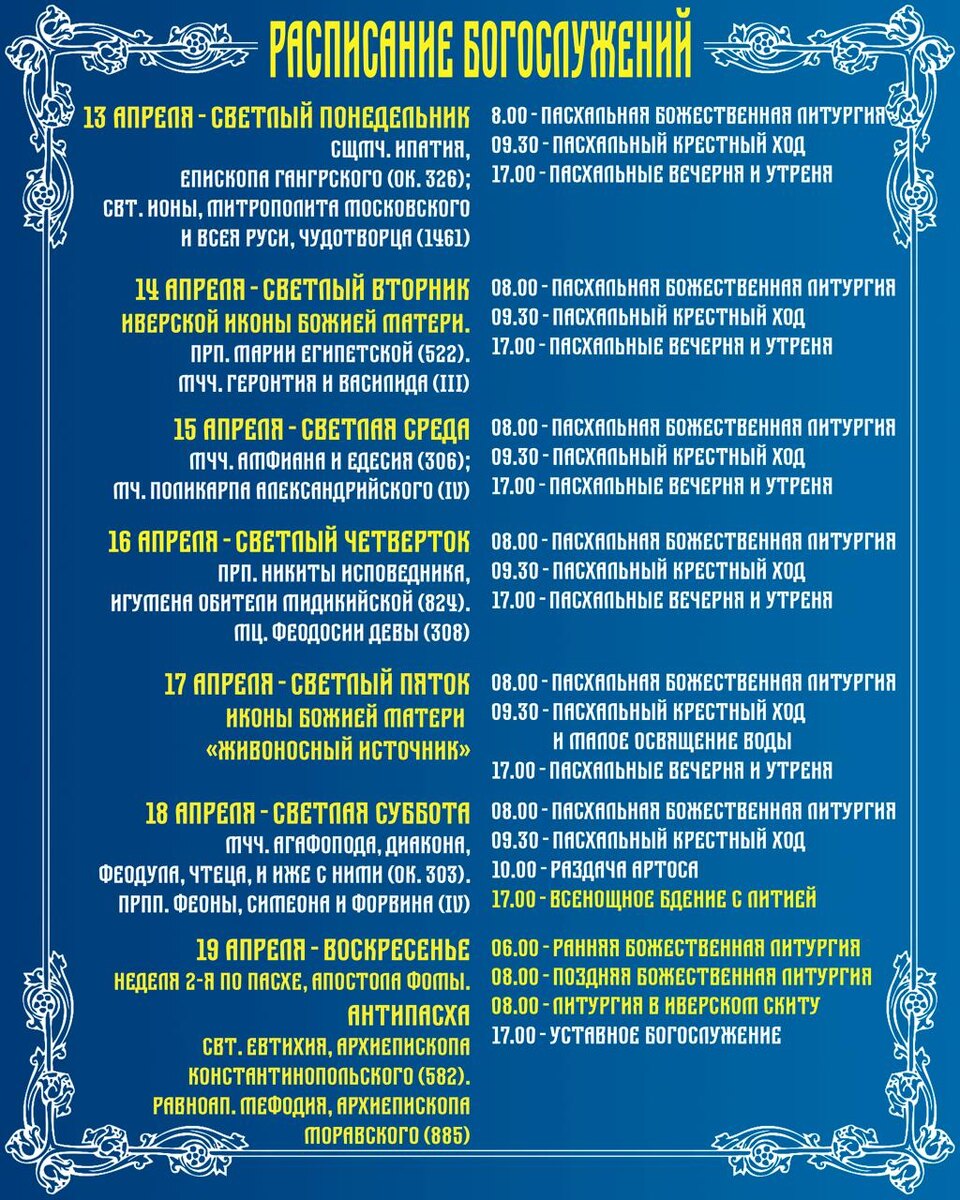 Расписание богослужений Светлой Седмицы